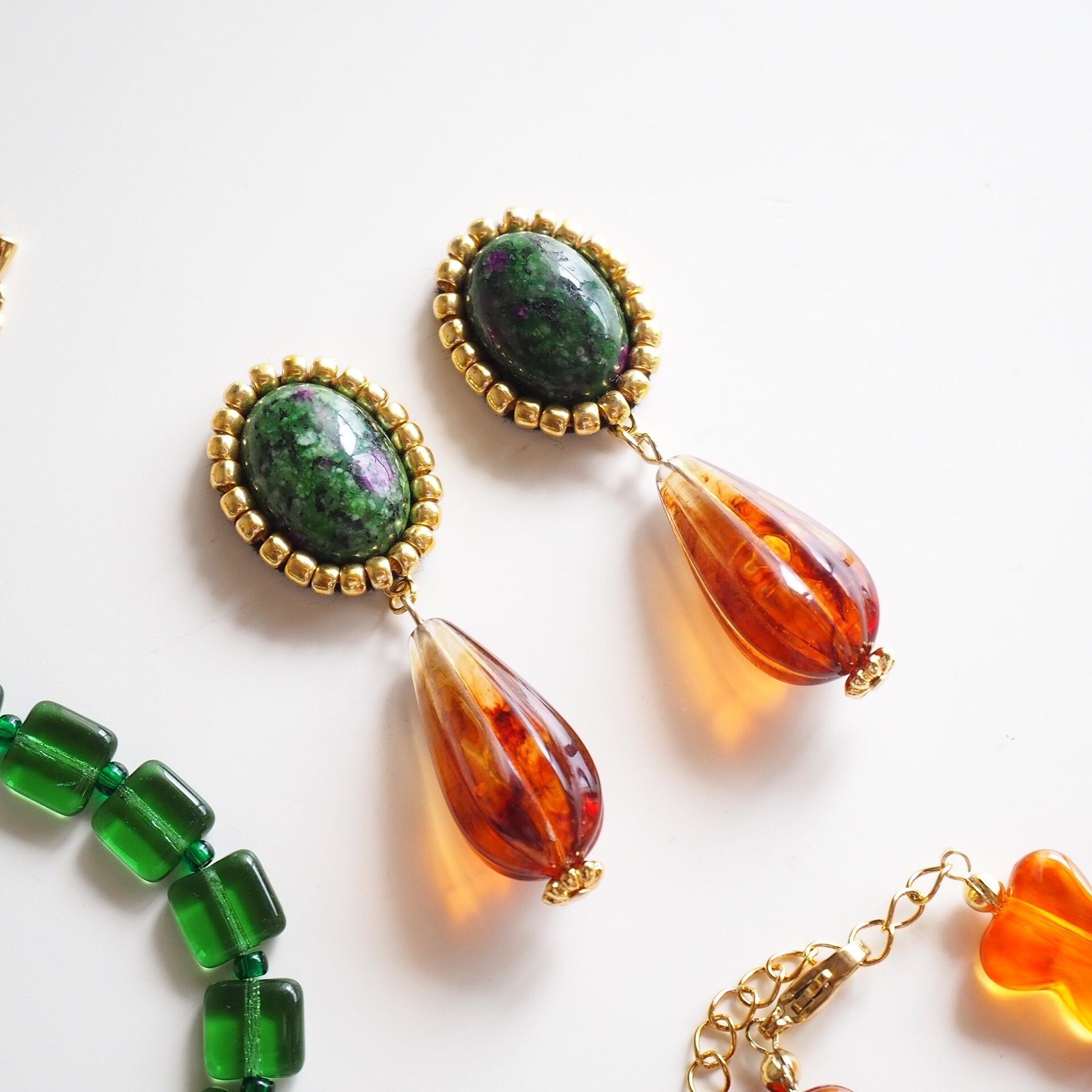 こちらは人気アイテム『天然石カボションとドロップビーズのピアス/イヤリング(ゾイサイト×ブラウン)』のoutlet商品です。