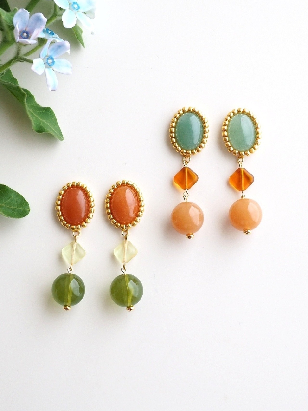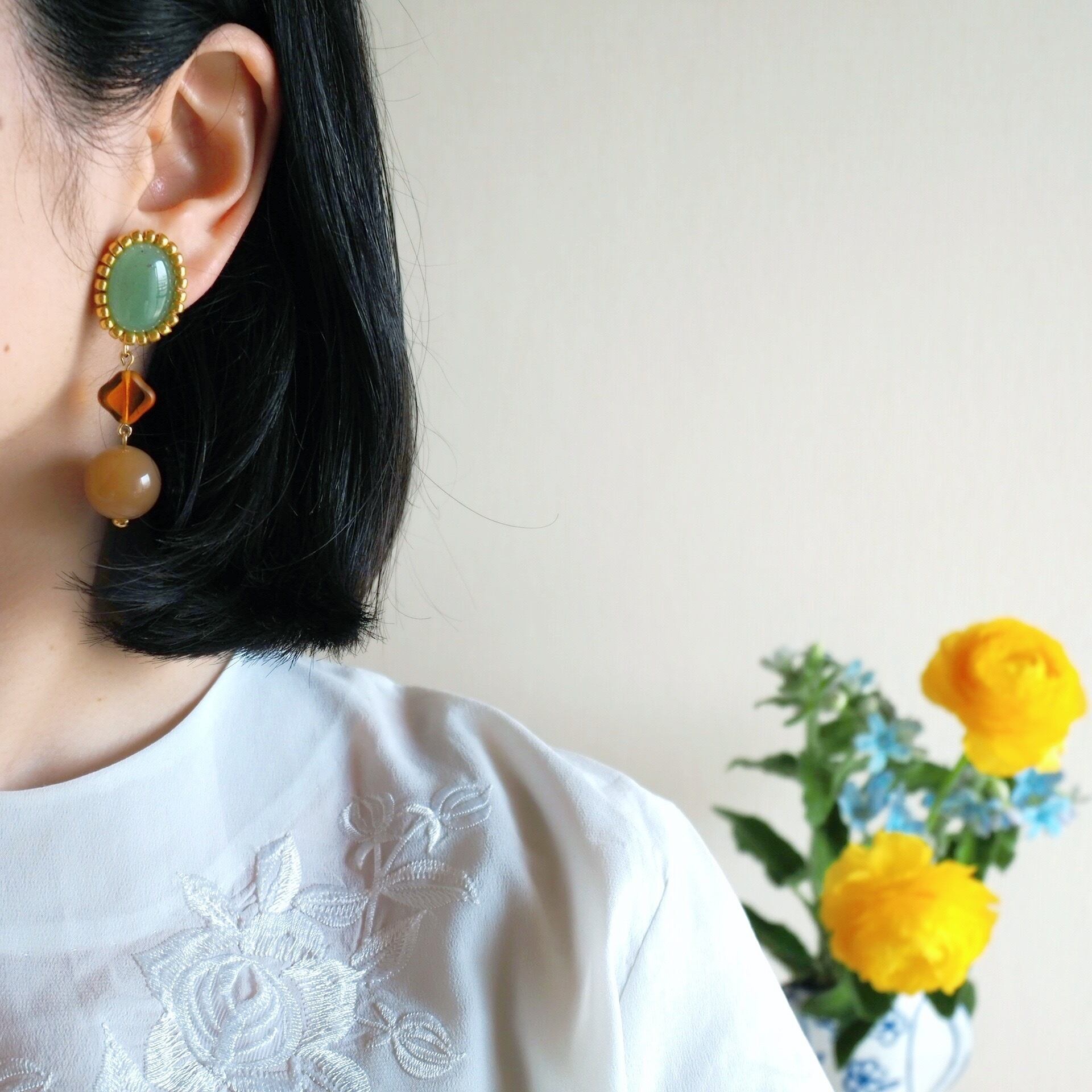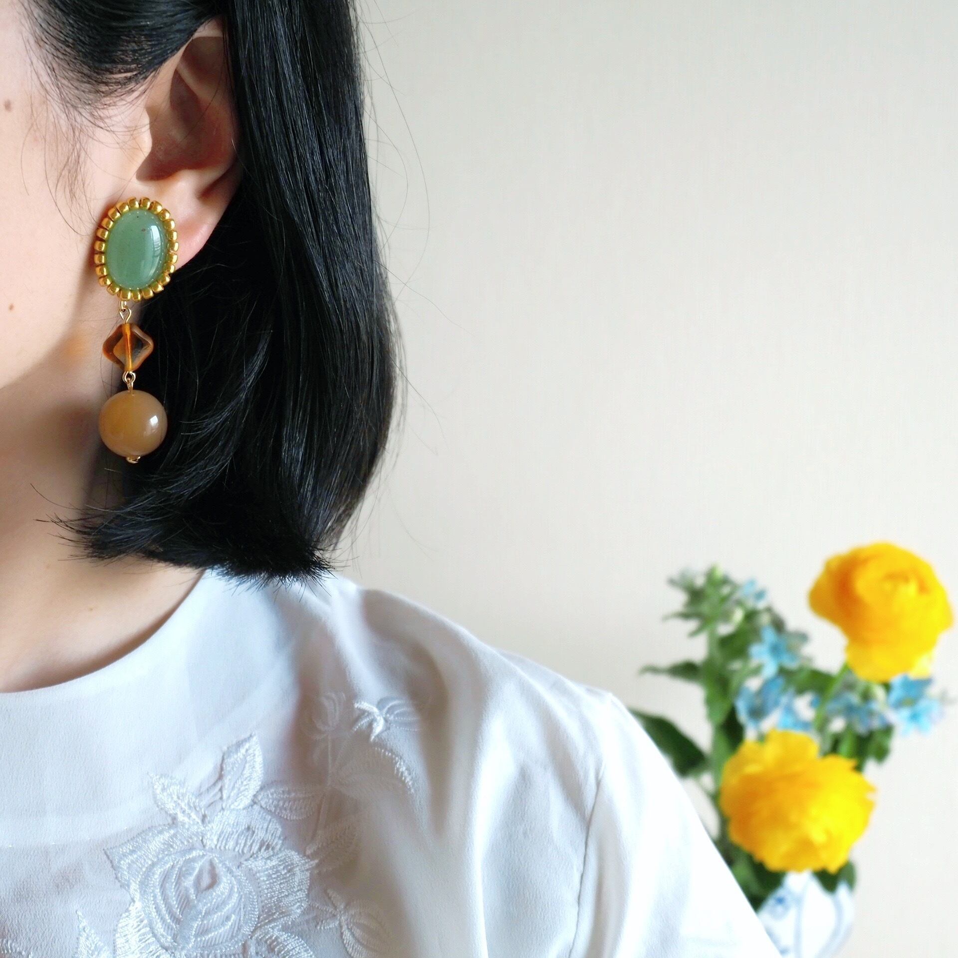 【Outlet sale!】天然石カボションのレトロなイヤリング/ピアス(ミント×ペールブラウン)