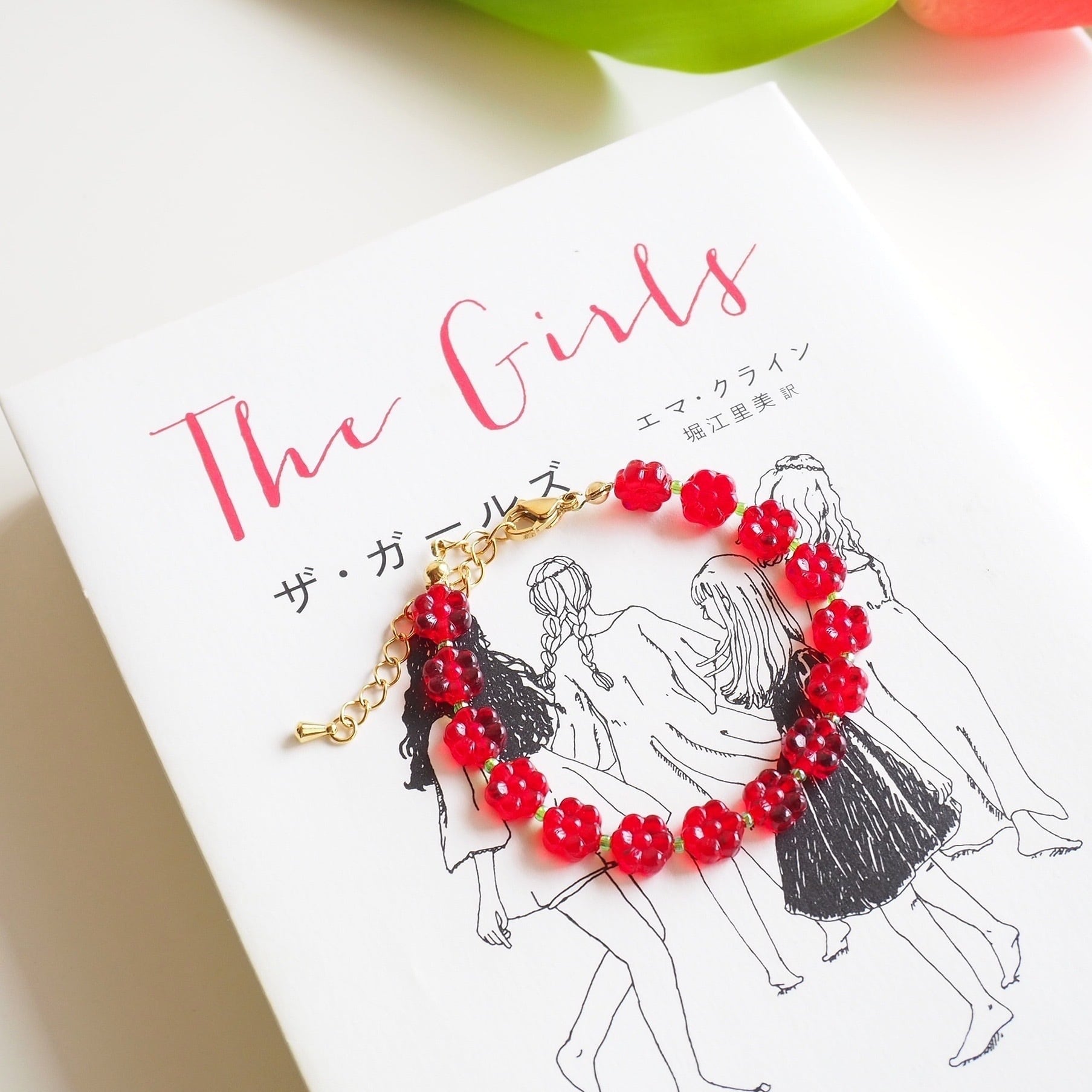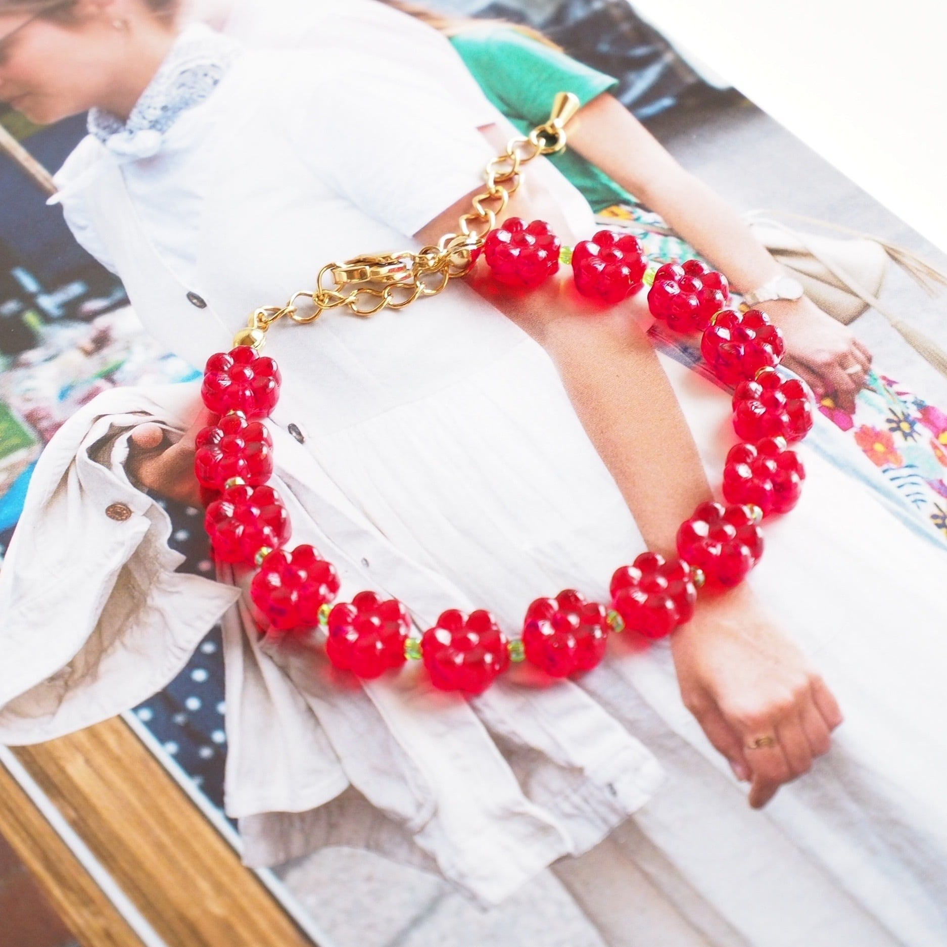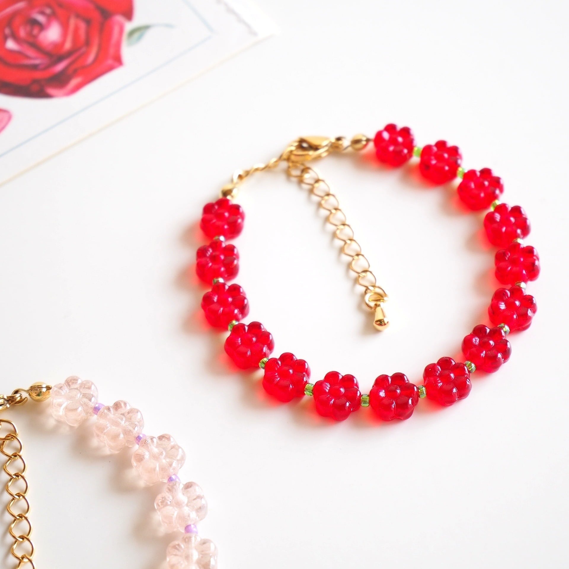 レトロなフラワー型チェコビーズのブレスレット(レッド)