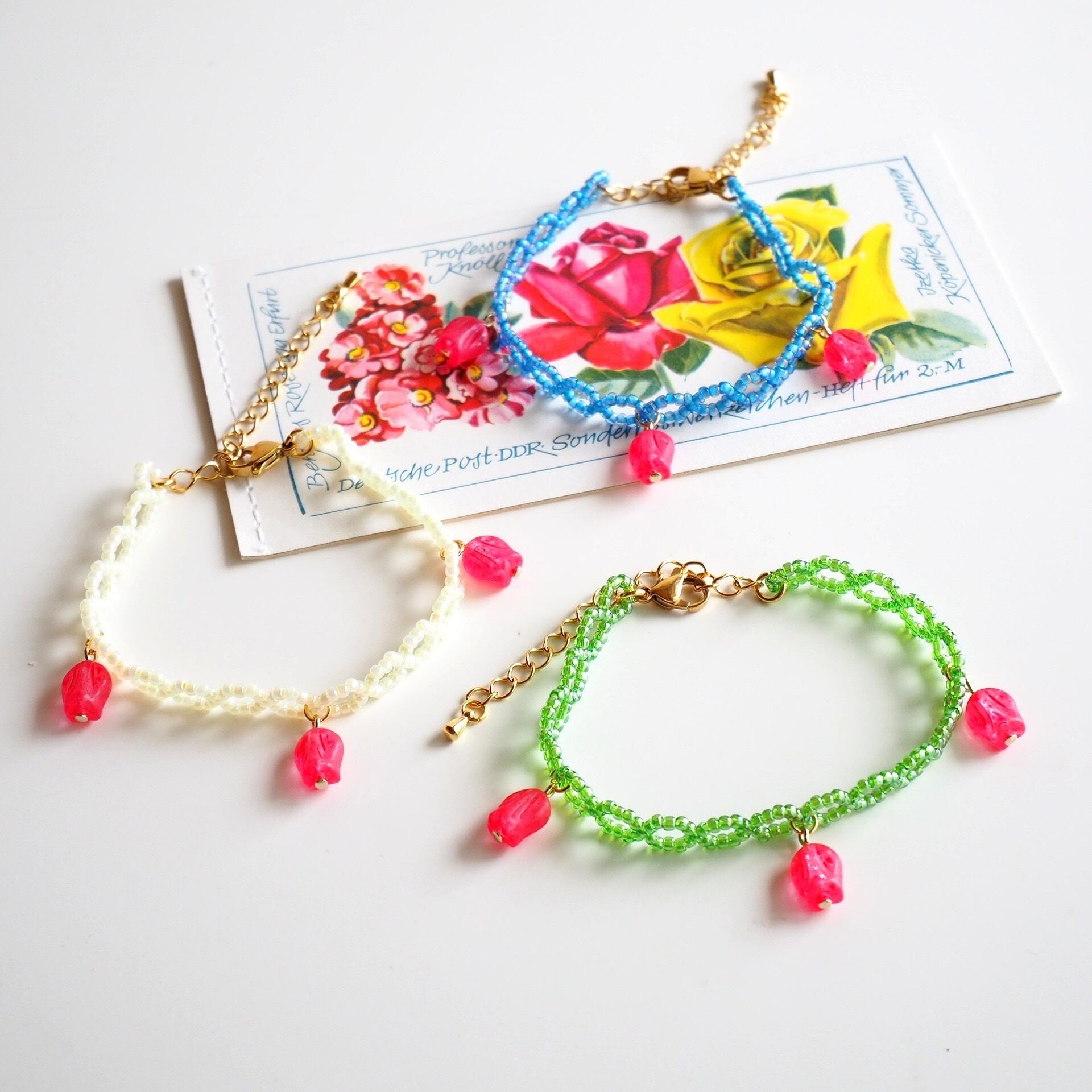 チューリップビーズのレース風ビーズブレスレット(エクリュ)