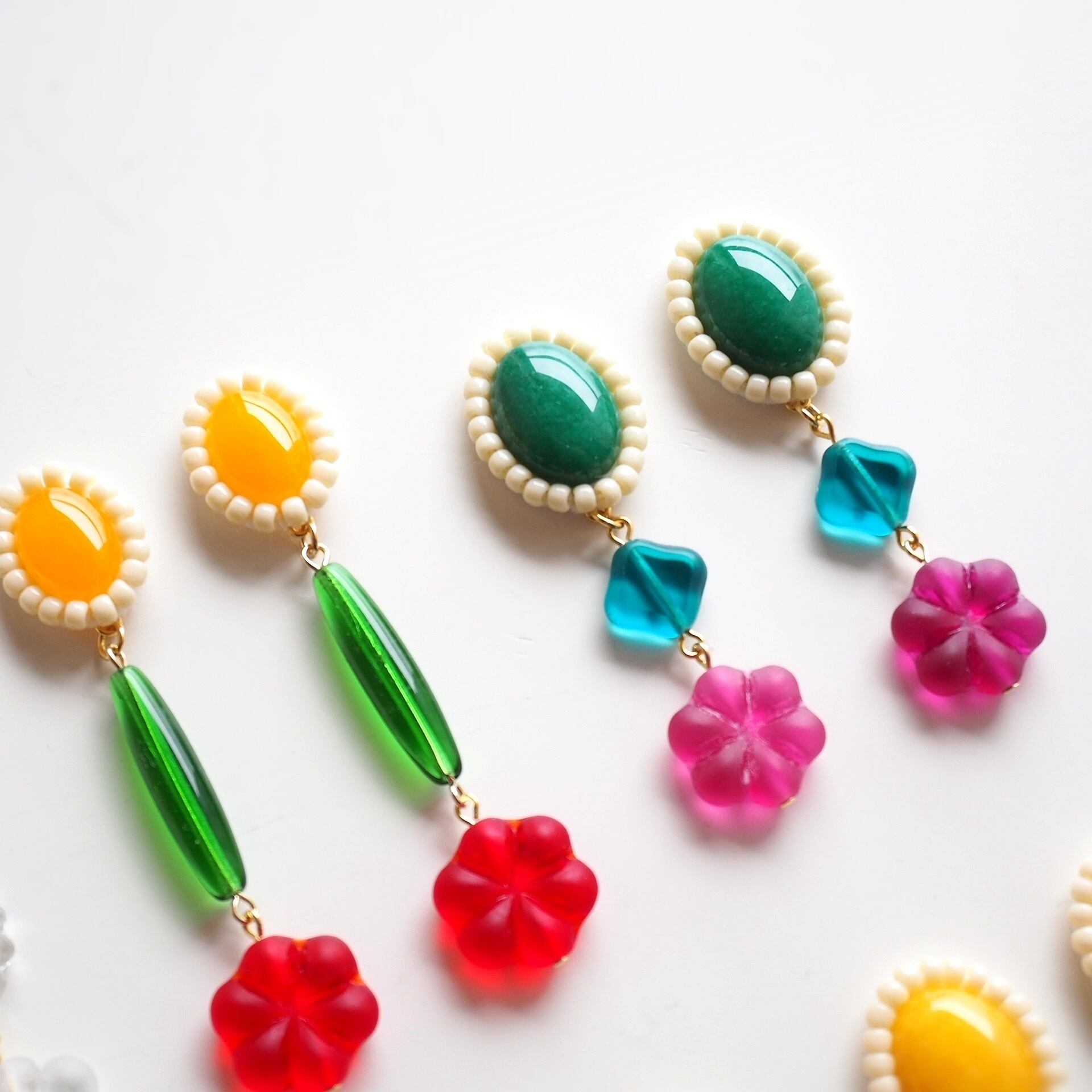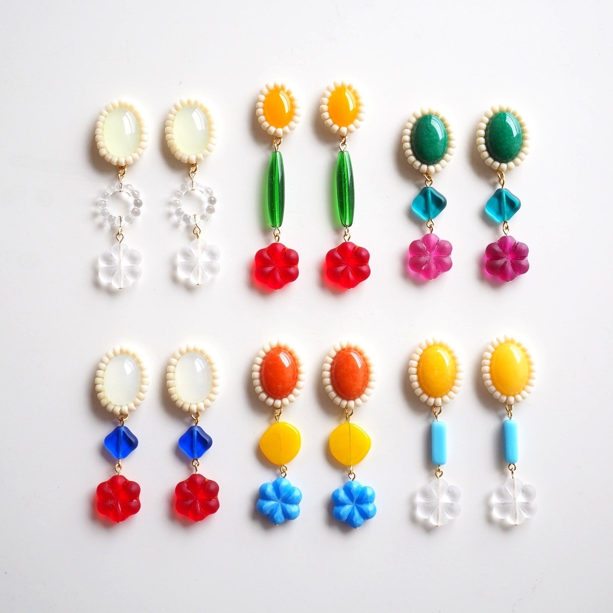 緑 グリーン ブルーグリーン 紫 パープル ワイン トリコロール フランス オフホワイト エクリュ 大振りイヤリング 大振りピアス プラスチック アクリル チェコビーズ 70年代 70s 70年代ファッション レトロポップ 昭和レトロ 古着 古着屋 レトロピアス レトロイヤリング レトロアクセサリー