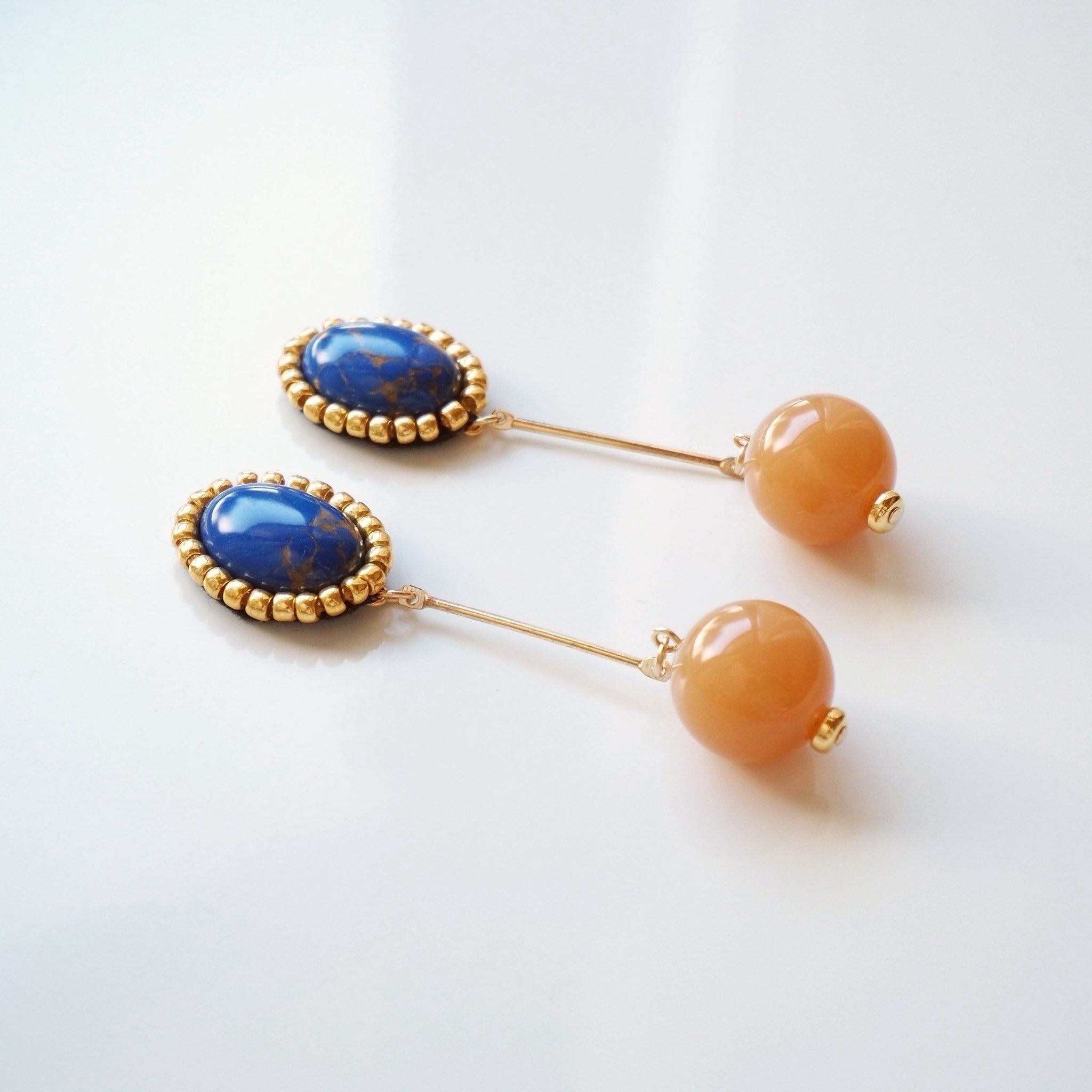 【Outlet sale!】オーバルカボションとビーズの大ぶりピアス/イヤリング(ブラック×ブルー)