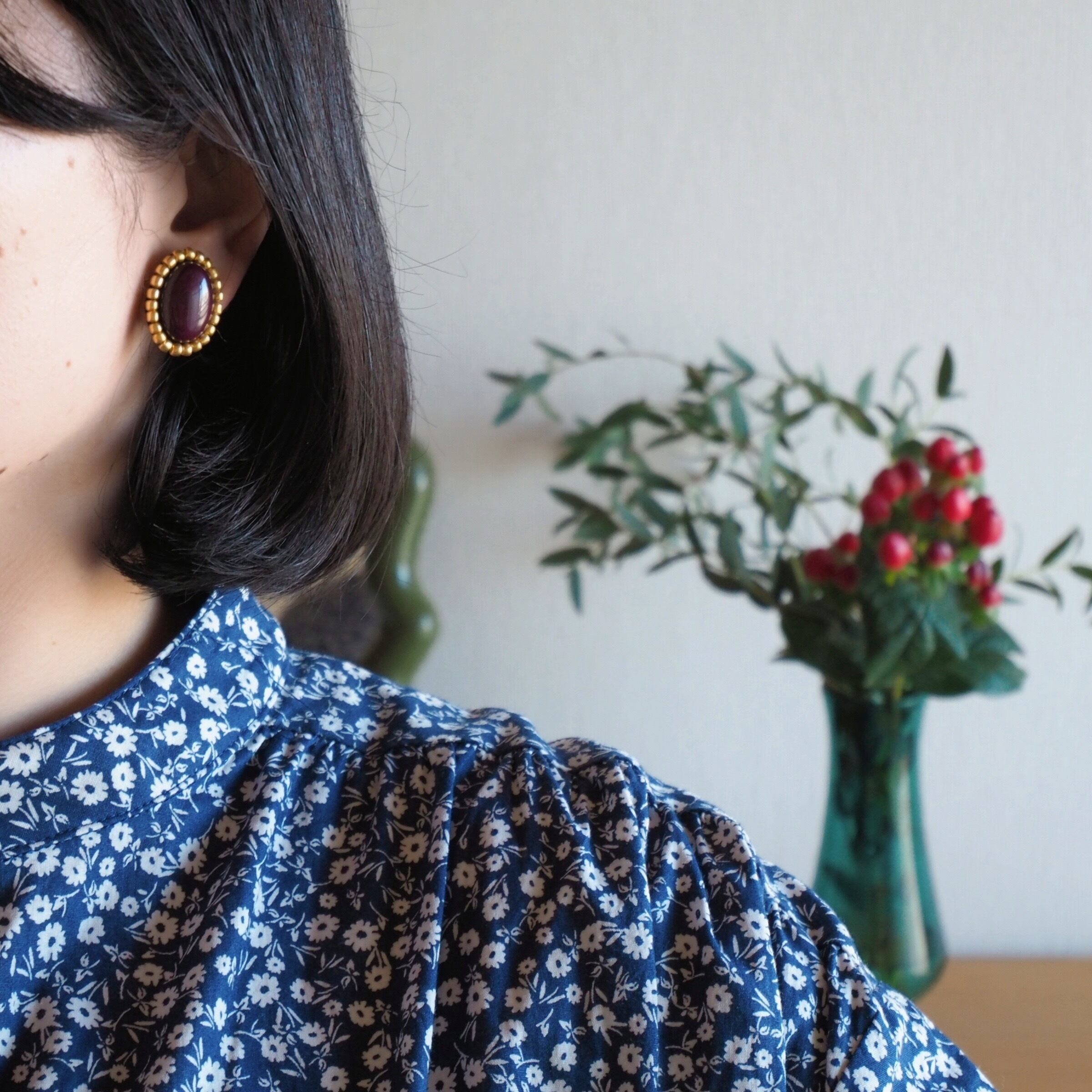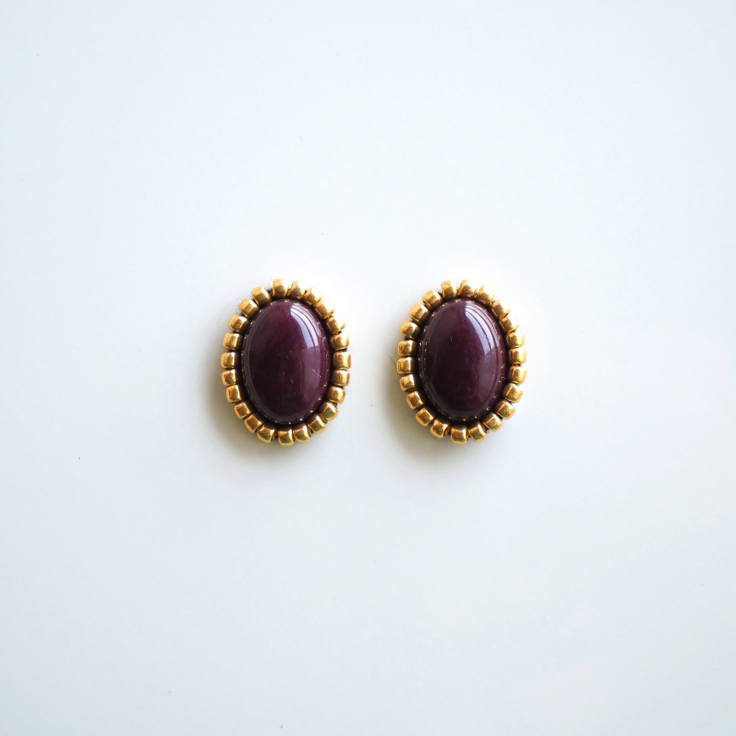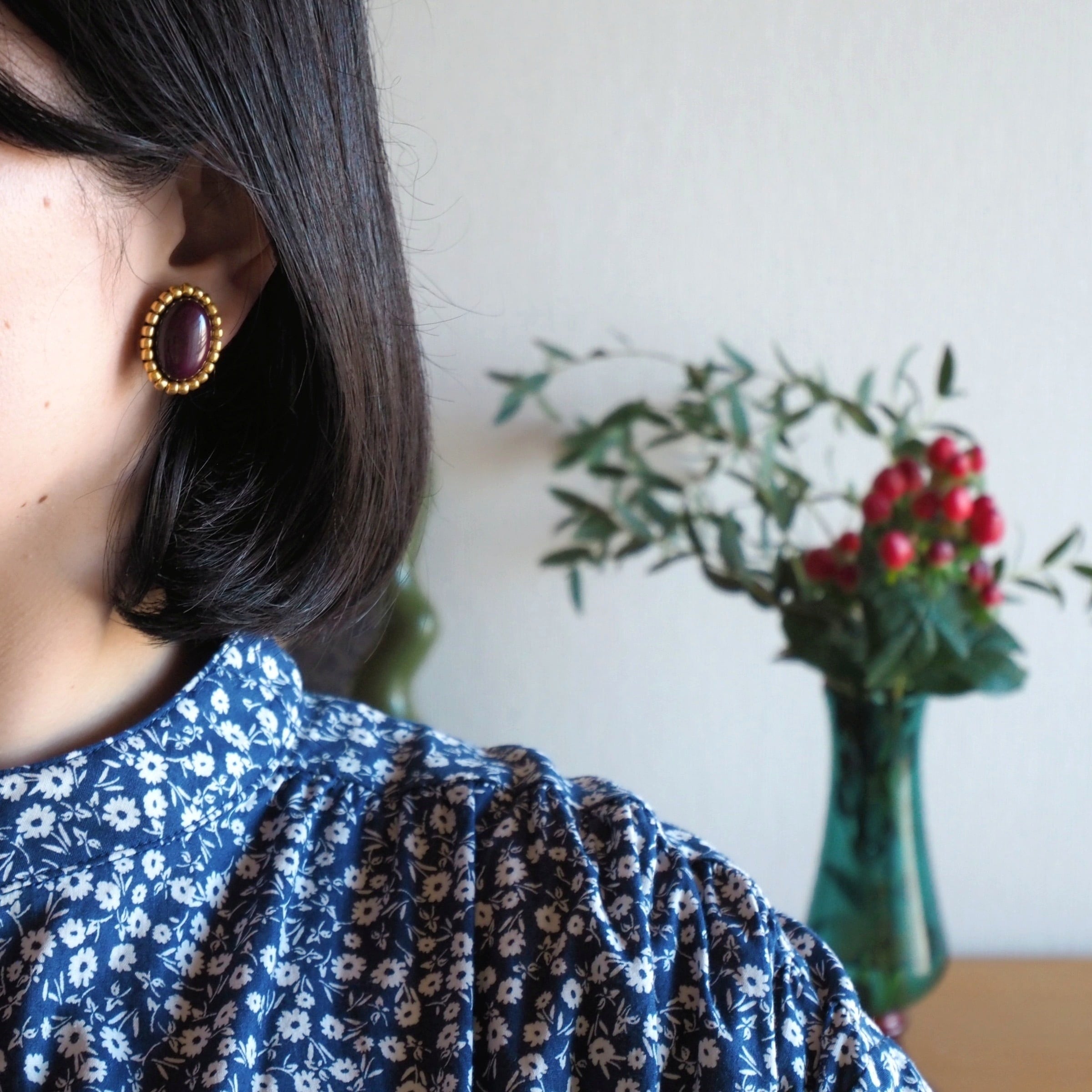 天然石 天然石カボション ダークレッド ワインレッド 小豆色 オーバルカボション カボション 一粒ピアス 一粒イヤリング シンプル ゴールド 金 70年代 70s 70年代ファッション 80年代 80s 80年代ファッション レトロ レトロピアス レトロイヤリング レトロアクセサリー ビーズ刺繍 刺繍イヤリング 刺繍ピアス 古着屋