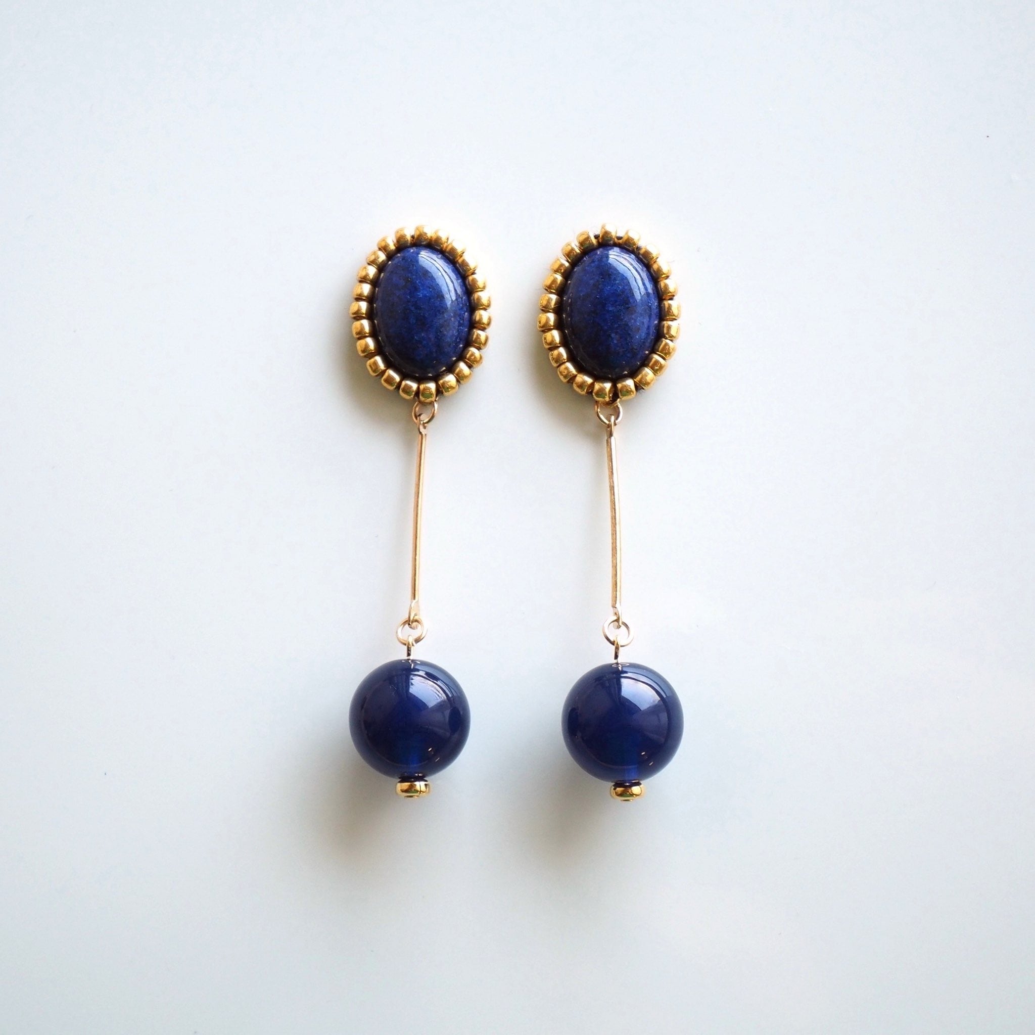オーバルカボションとラウンドビーズのピアス/イヤリング(ネイビー)