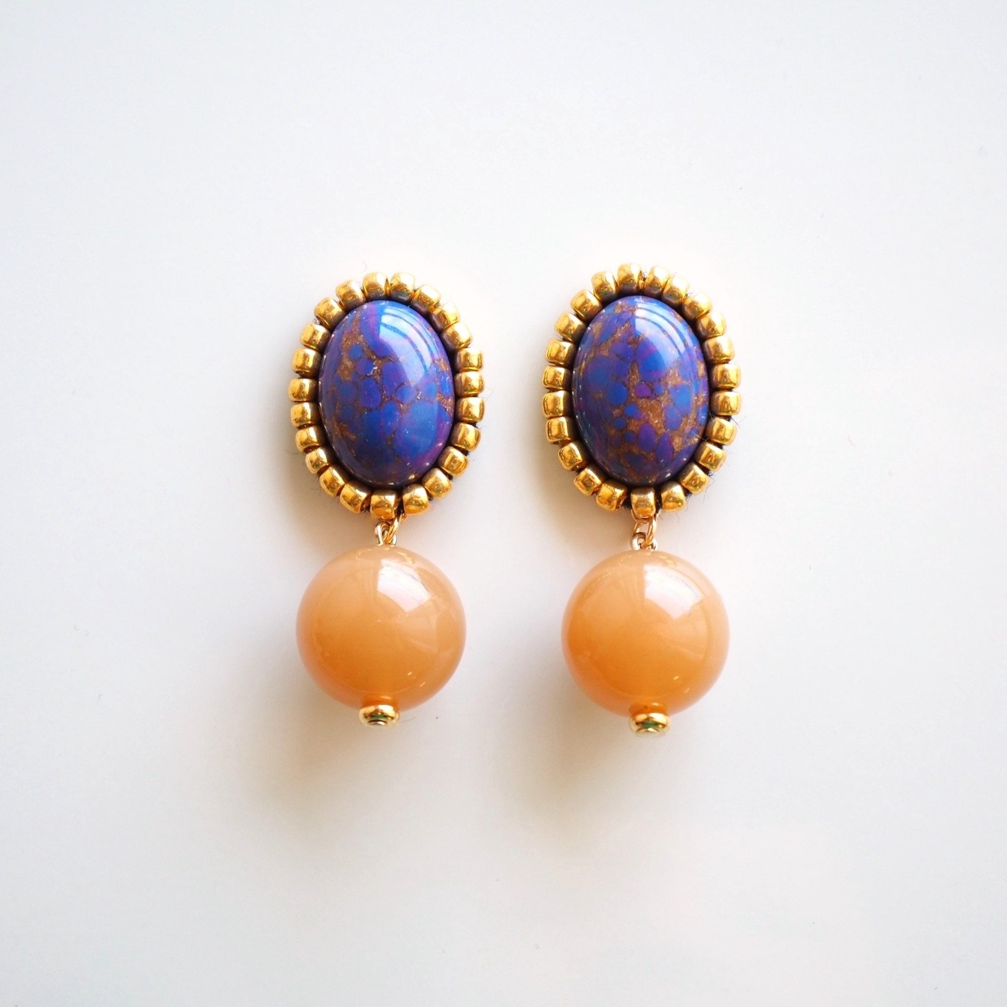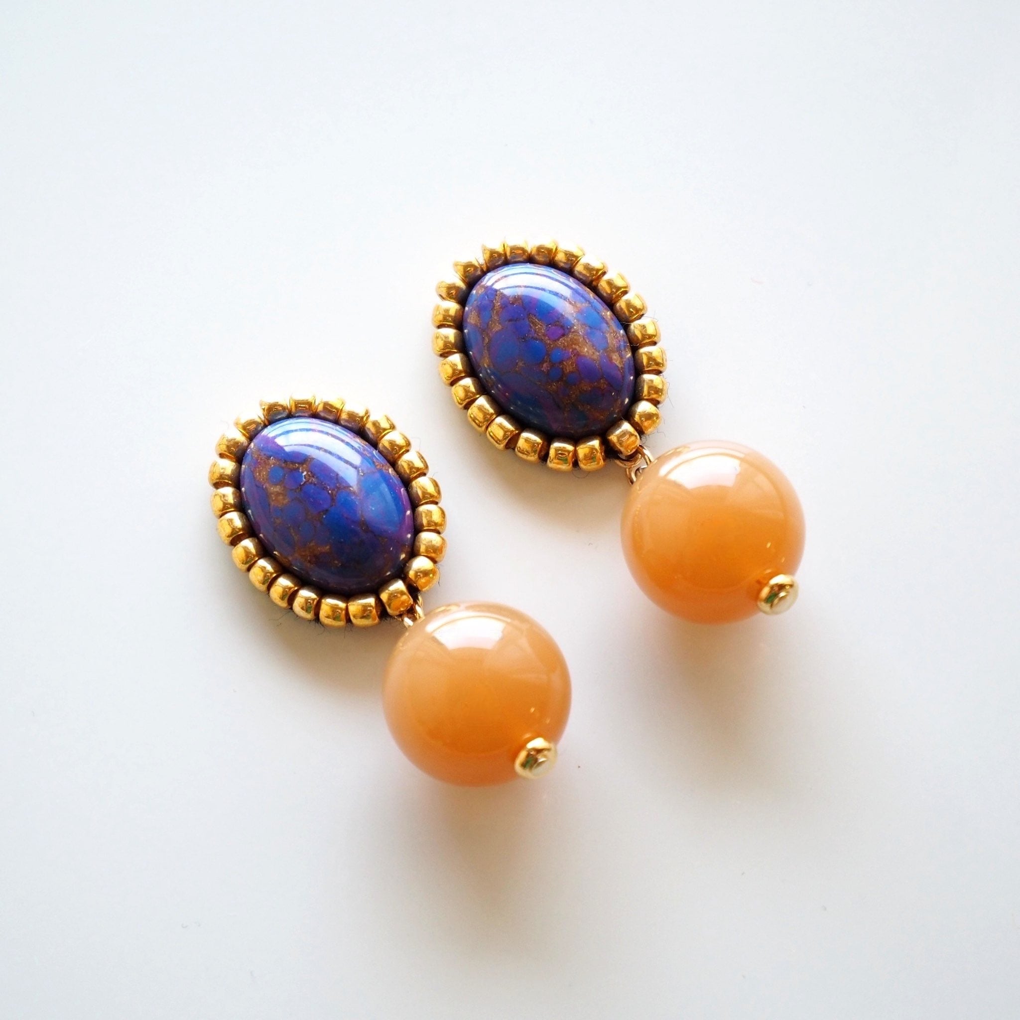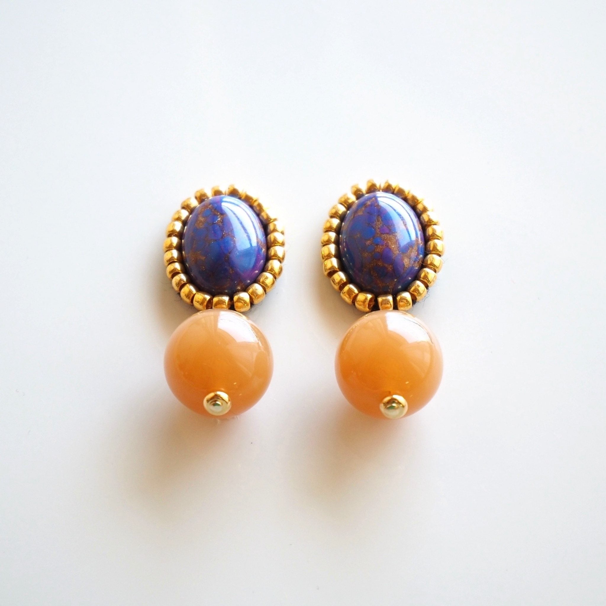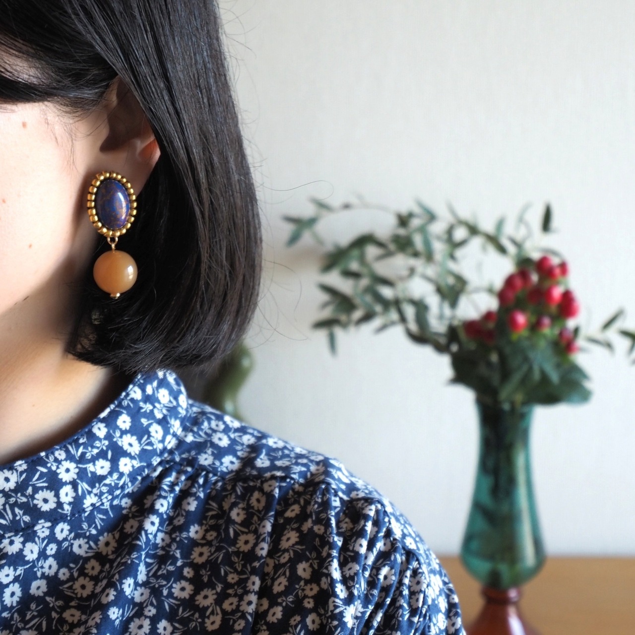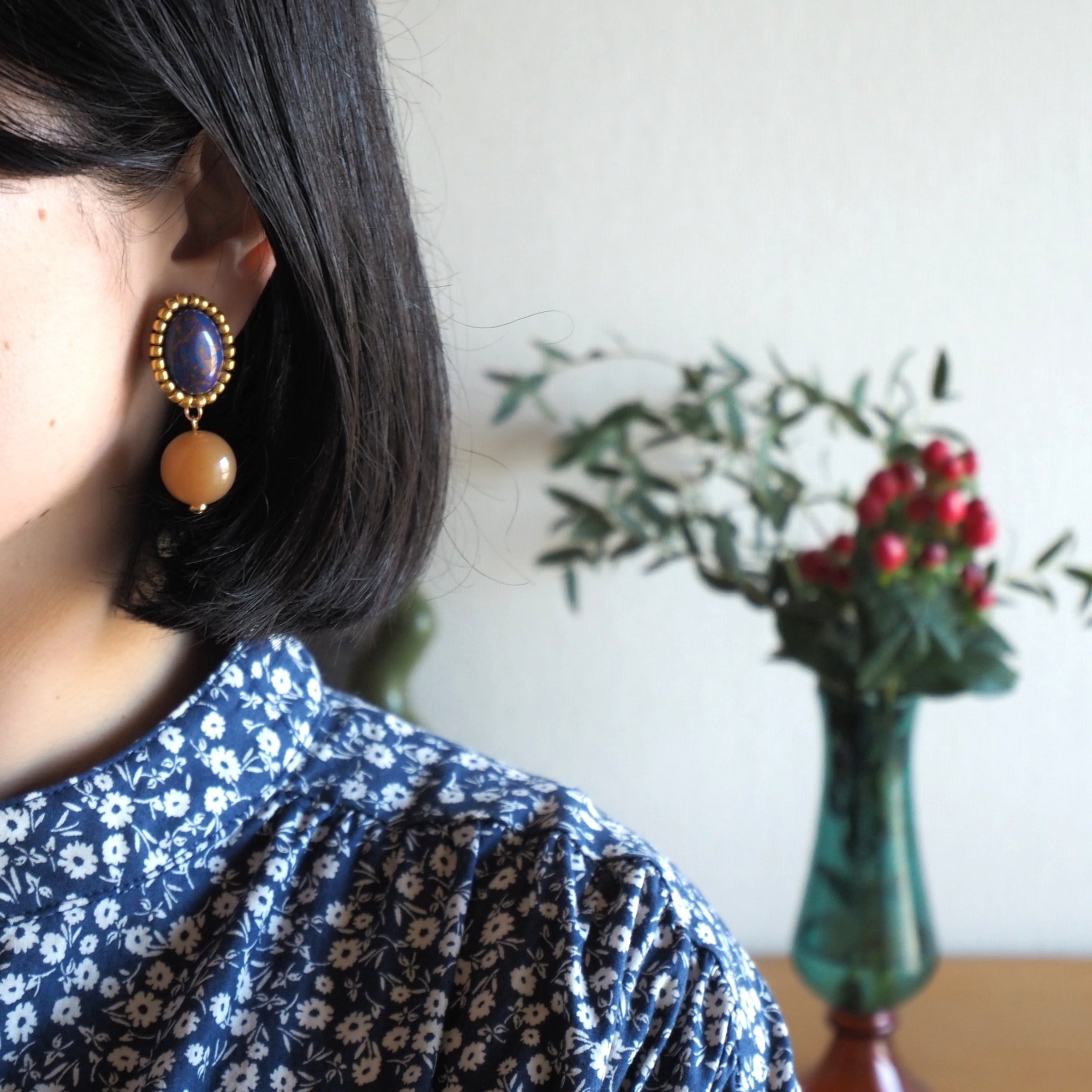 ブラウン 茶色 ゴールド 金色 オーバルカボション 一粒ピアス 一粒イヤリング シンプル ゴールド 金 ゴールド 70年代 70s 70年代ファッション 80年代 80s 80年代ファッション シンプル レトロ レトロピアス レトロイヤリング レトロアクセサリー ビーズ刺繍 刺繍イヤリング 刺繍ピアス 古着屋