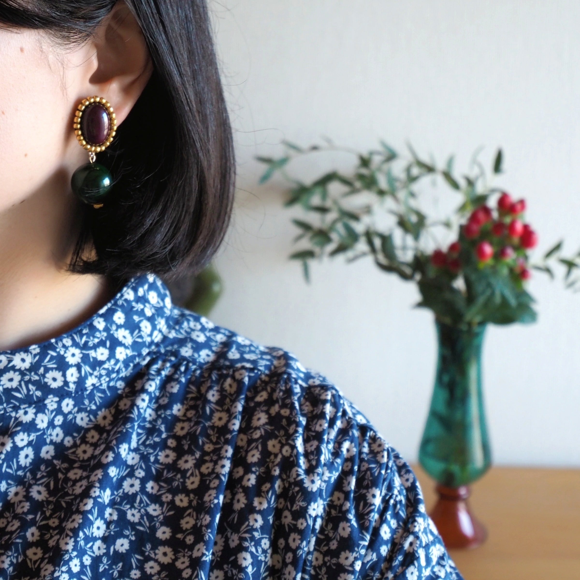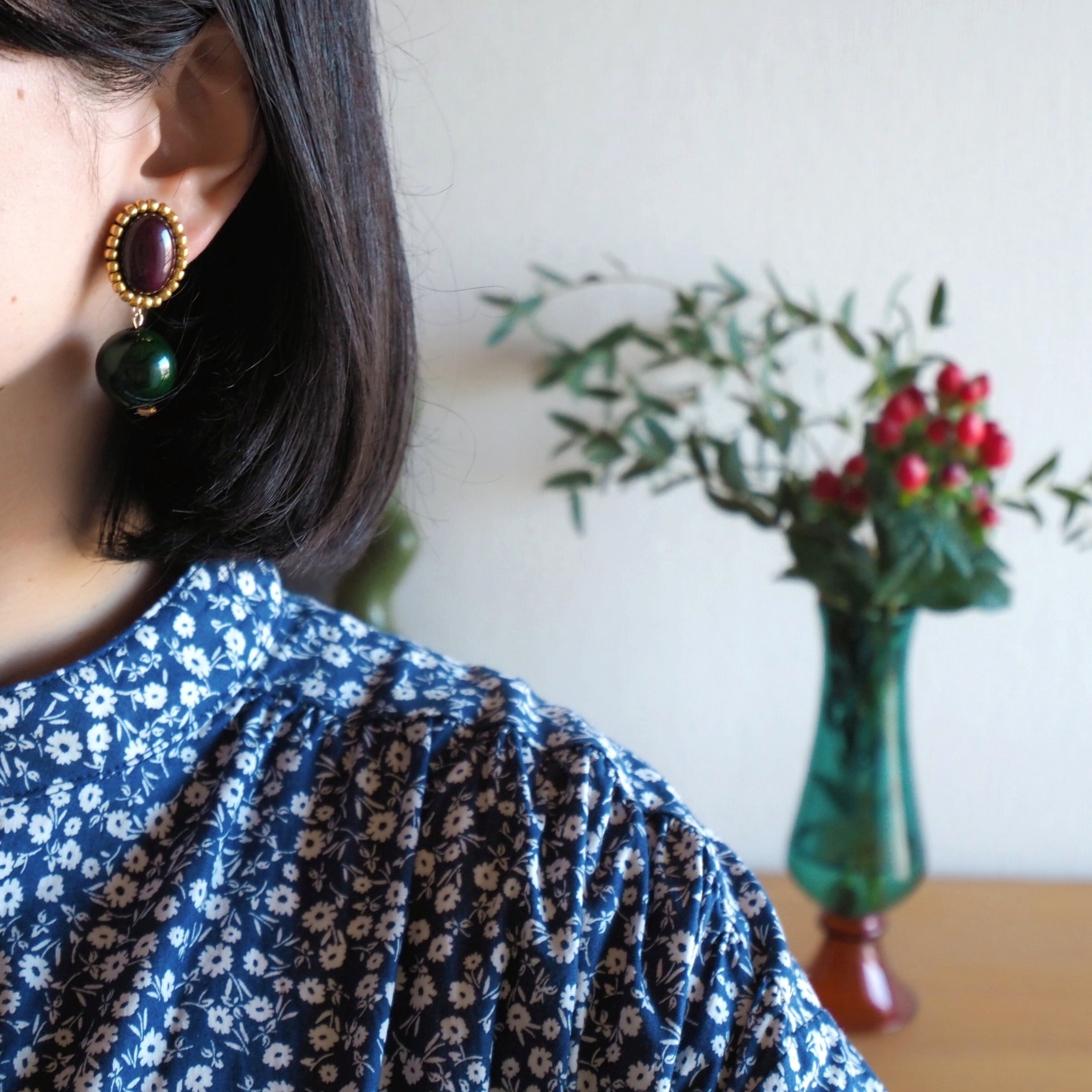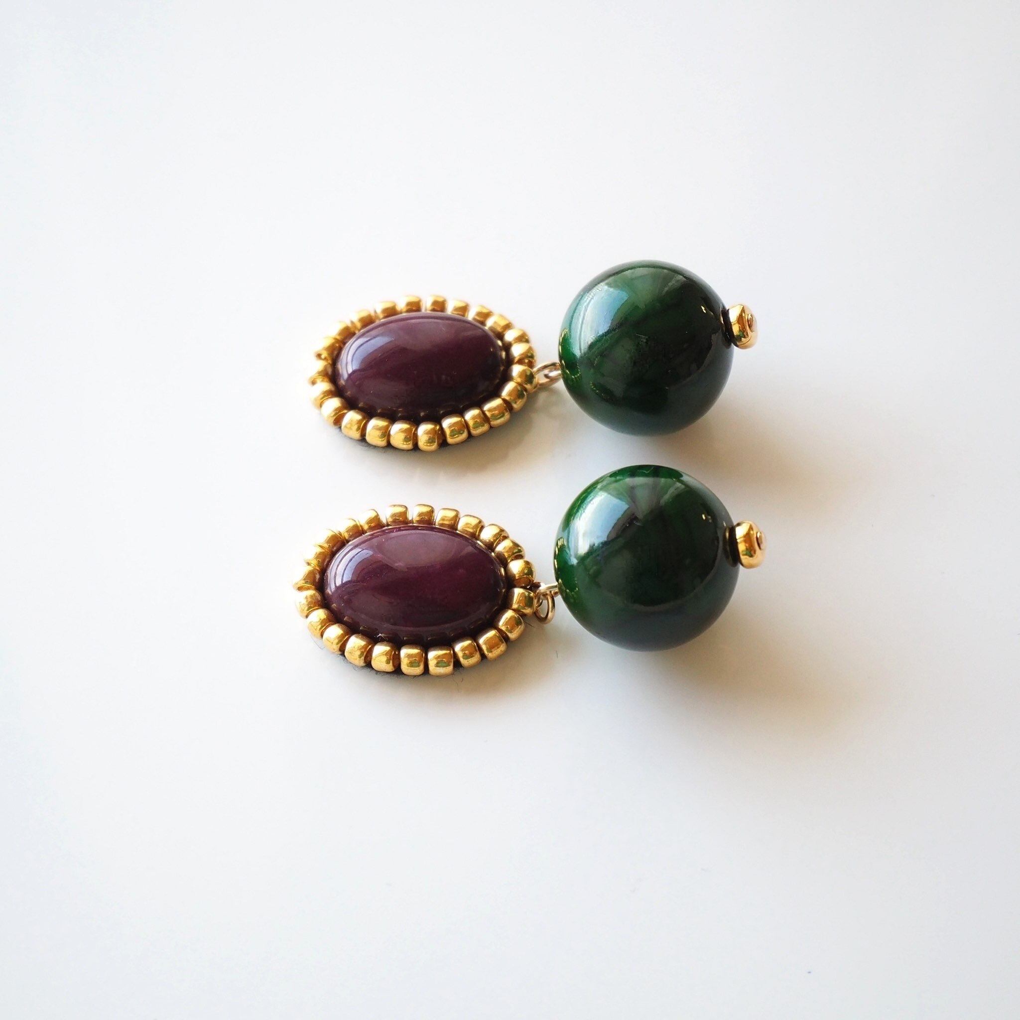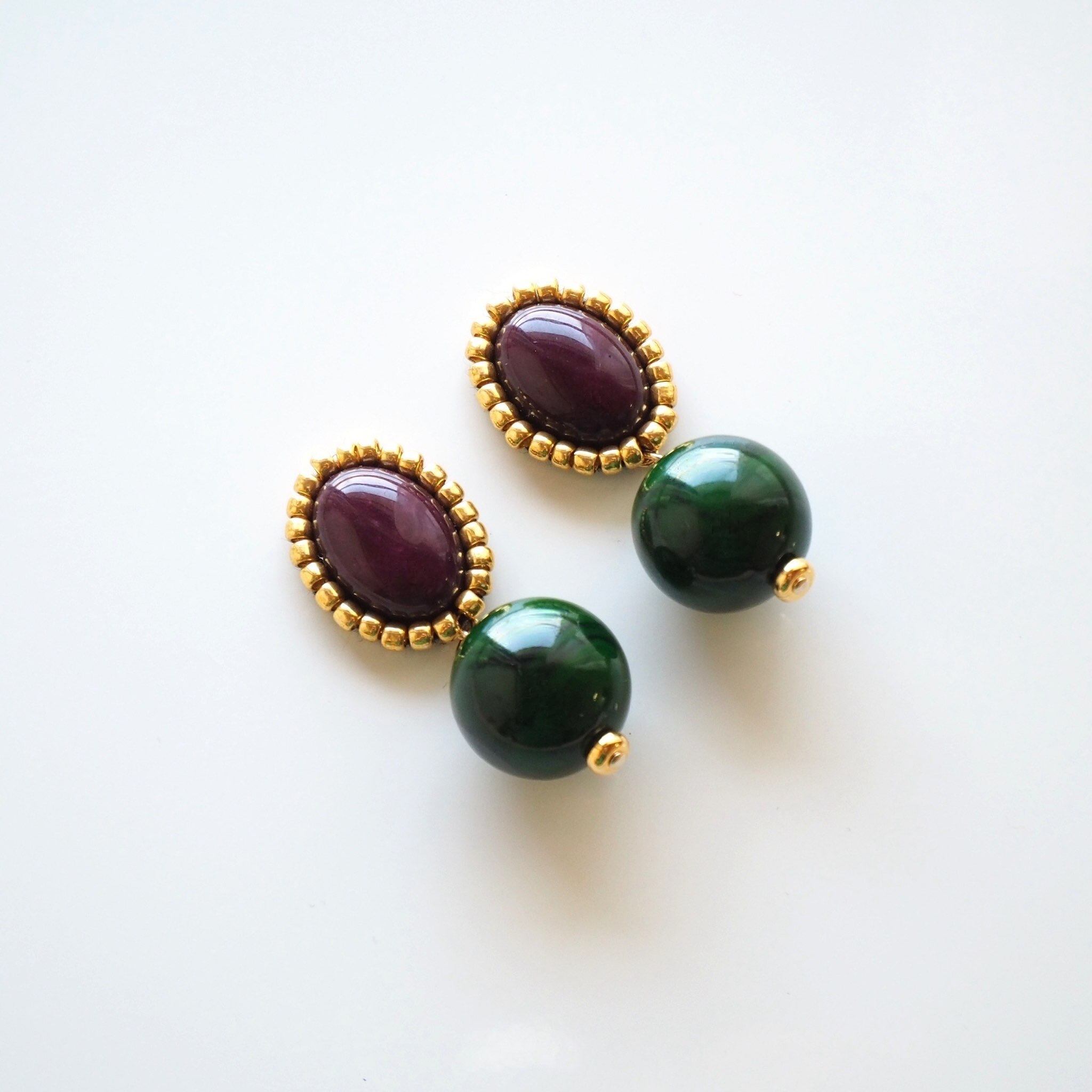 ダークレッド 小豆色 ワインレッド ダークグリーン 緑 濃い緑 茶色 ゴールド 金色 オーバルカボション 一粒ピアス 一粒イヤリング シンプル ゴールド 金 ゴールド 70年代 70s 70年代ファッション 80年代 80s 80年代ファッション シンプル レトロ レトロピアス レトロイヤリング レトロアクセサリー ビーズ刺繍 刺繍イヤリング 刺繍ピアス 古着屋