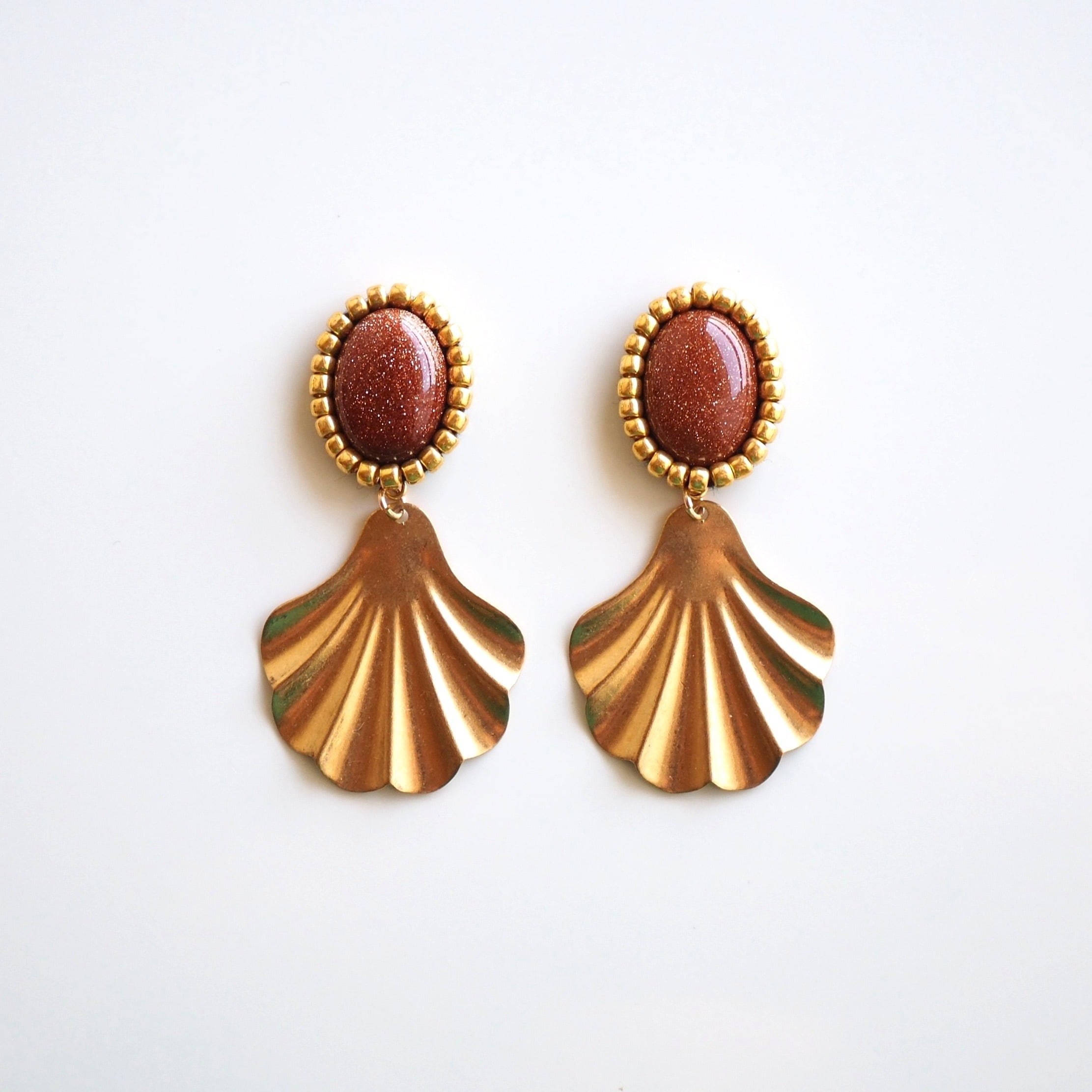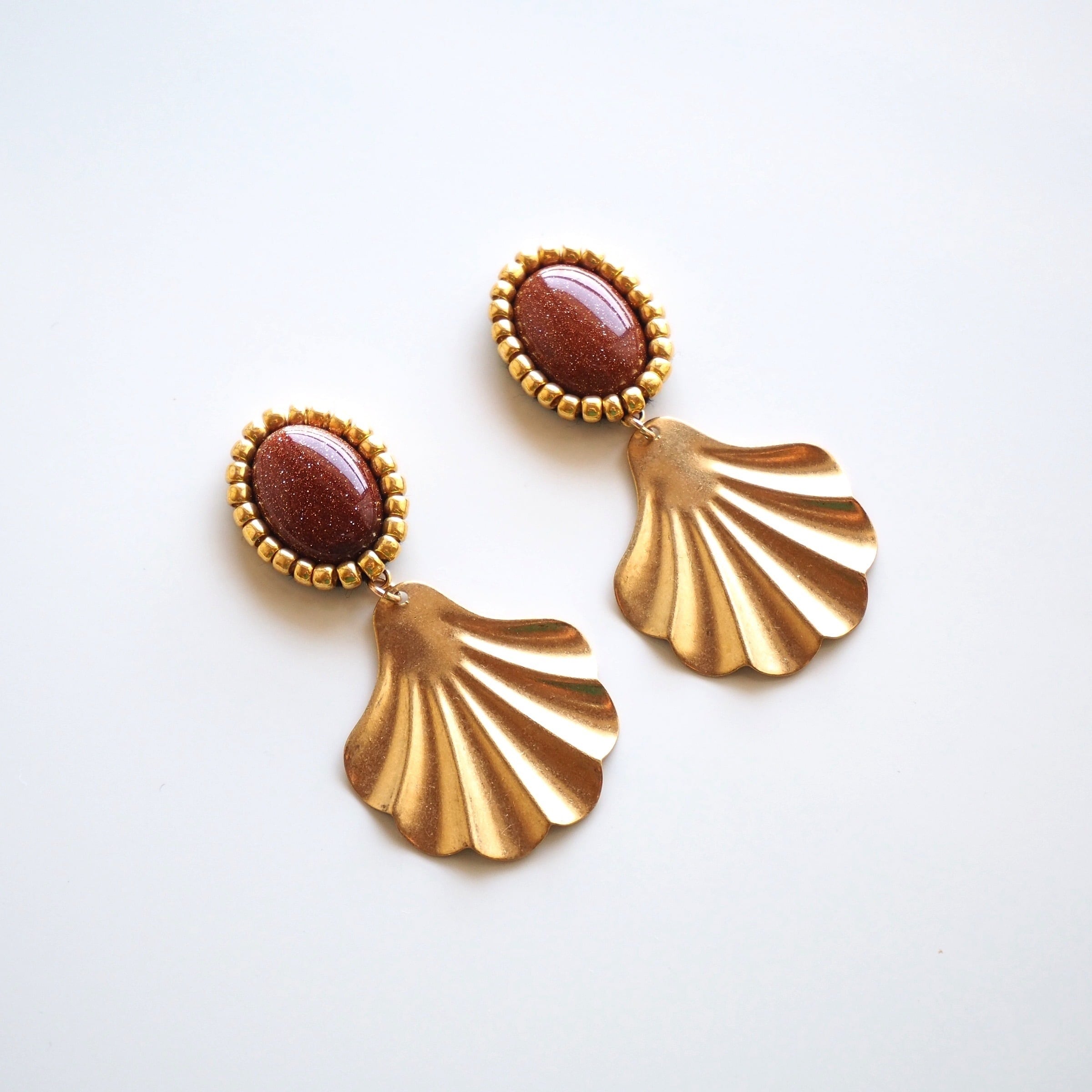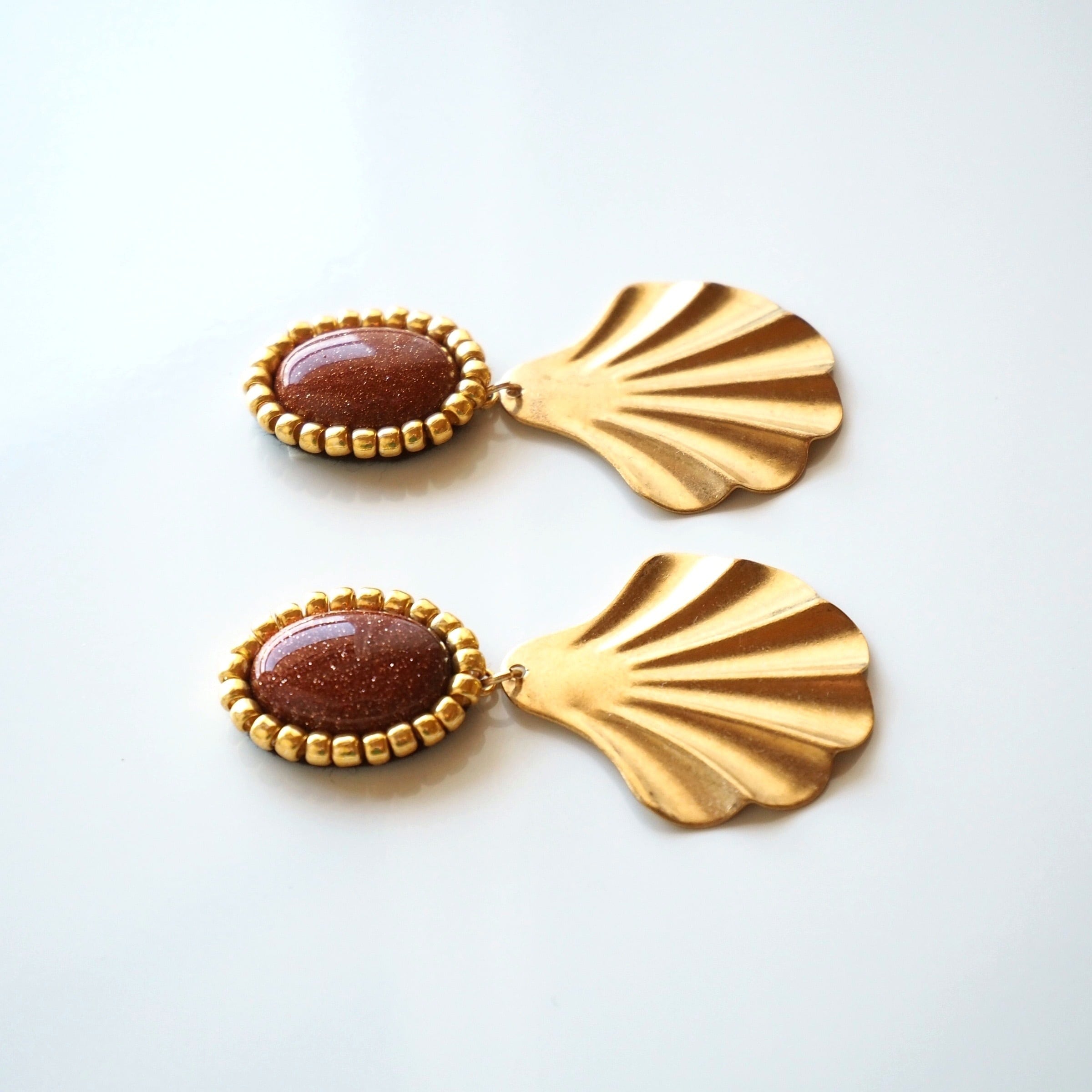 オーバルカボションと貝殻チャームの大ぶりピアス/イヤリング(ゴールドサンドストーン)