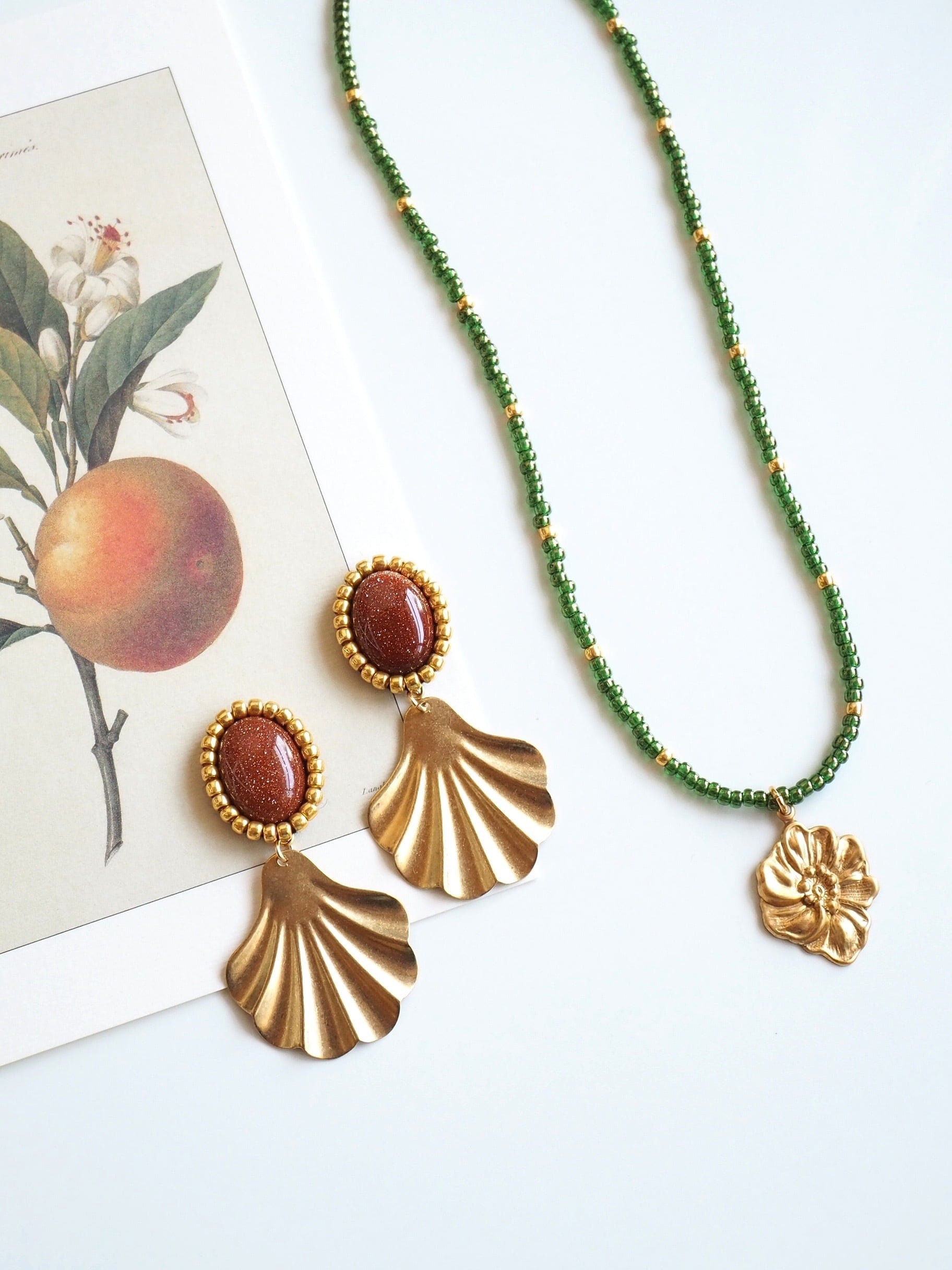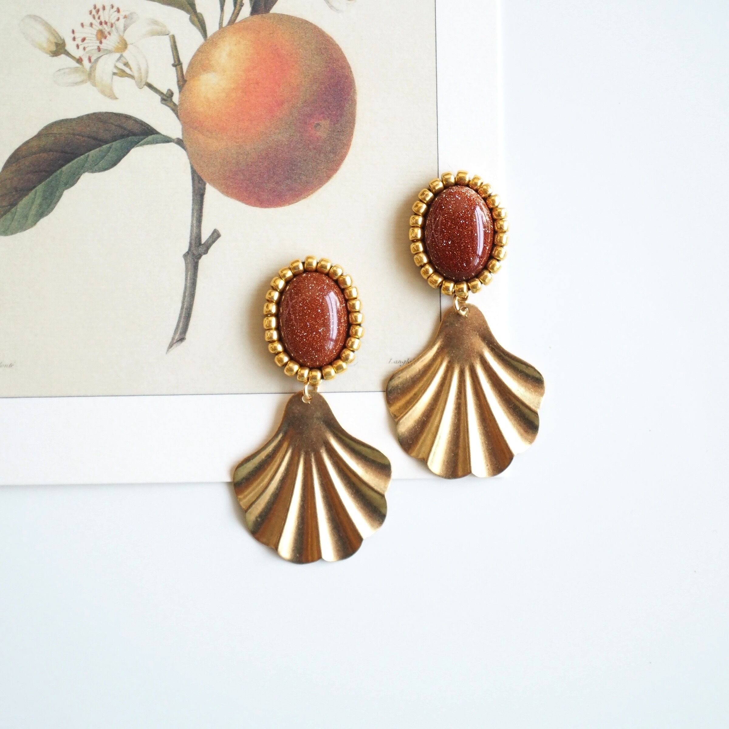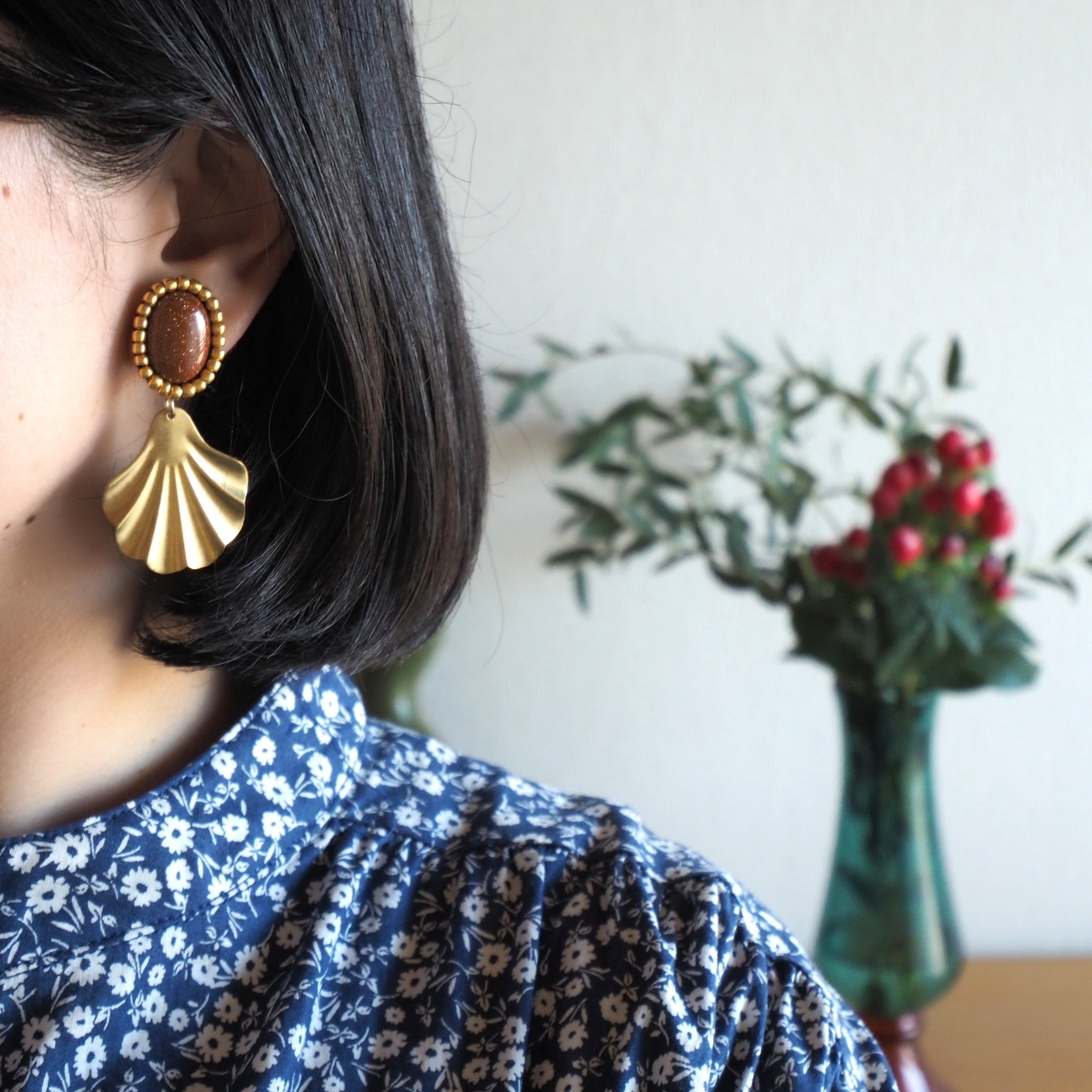 オーバルカボションと貝殻チャームの大ぶりピアス/イヤリング(ゴールドサンドストーン)