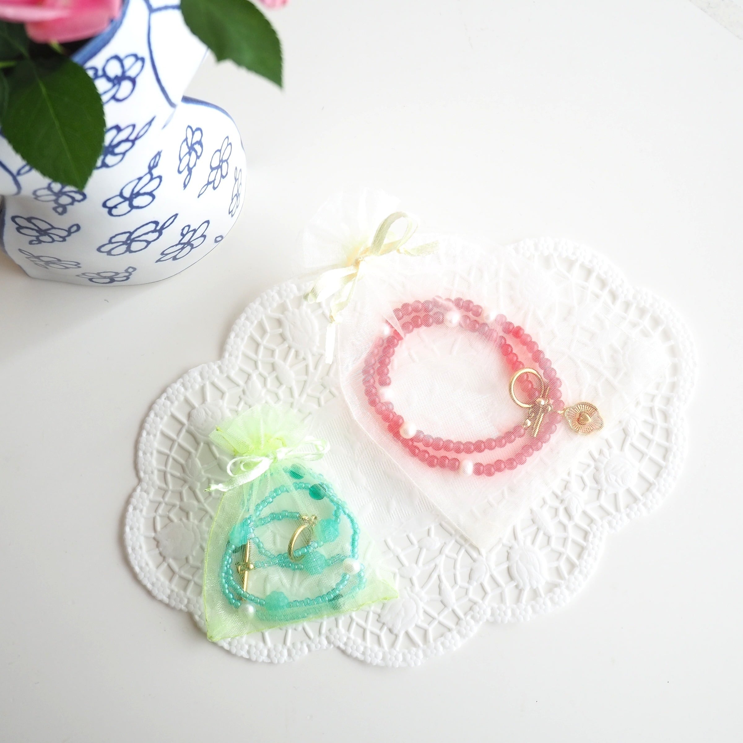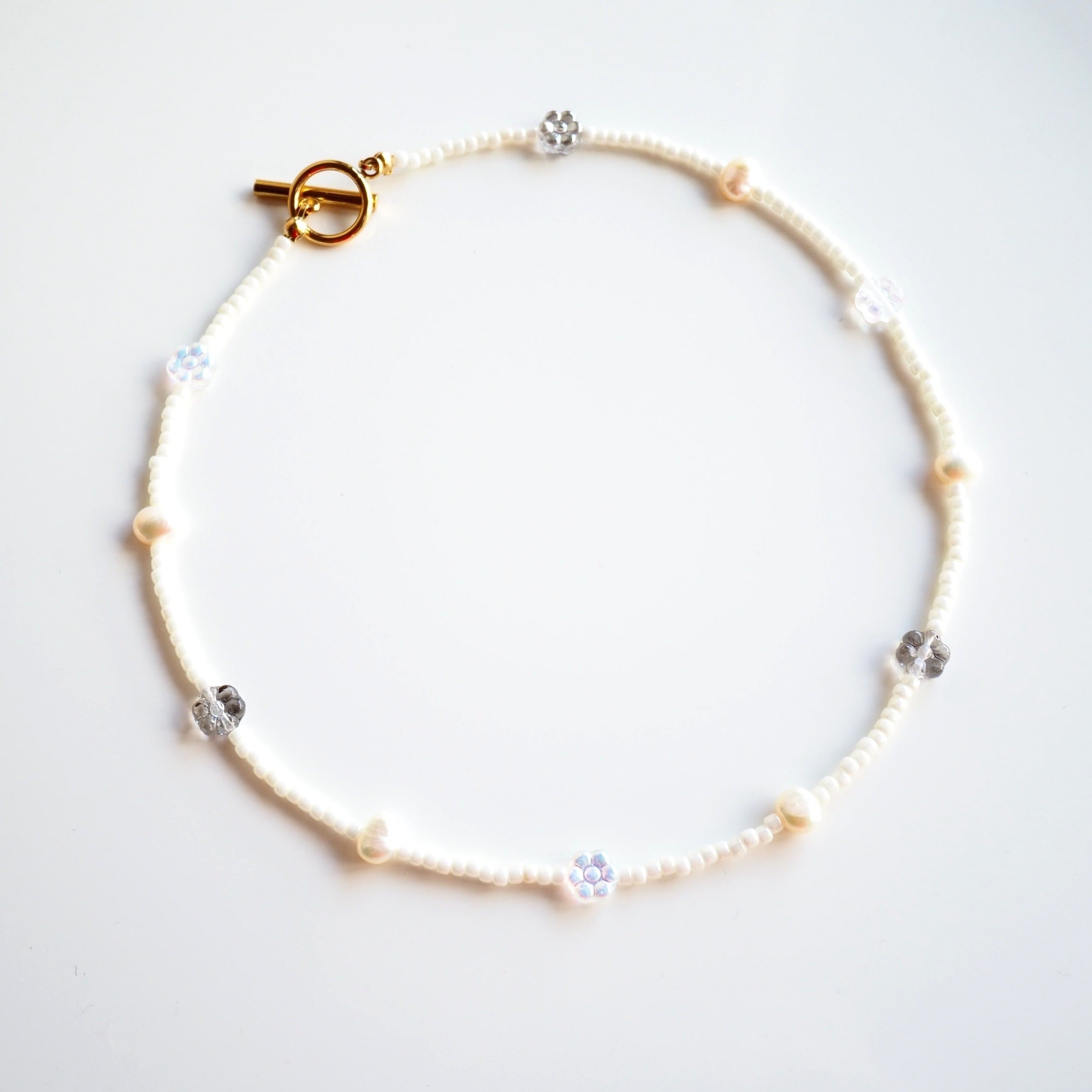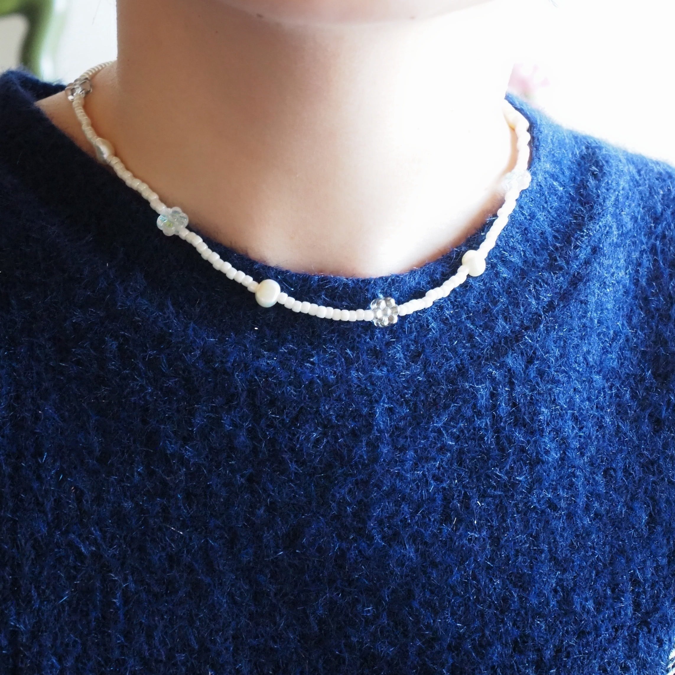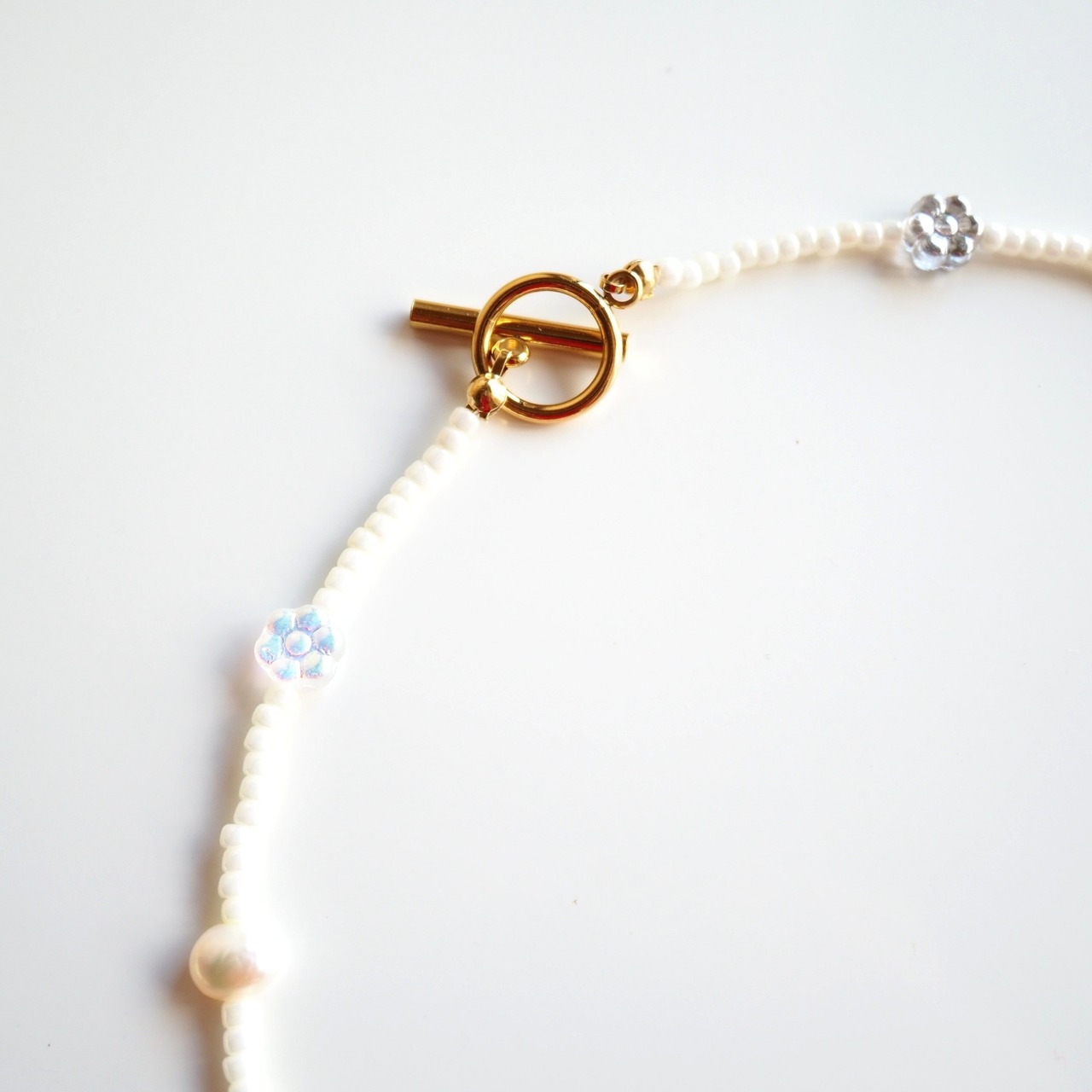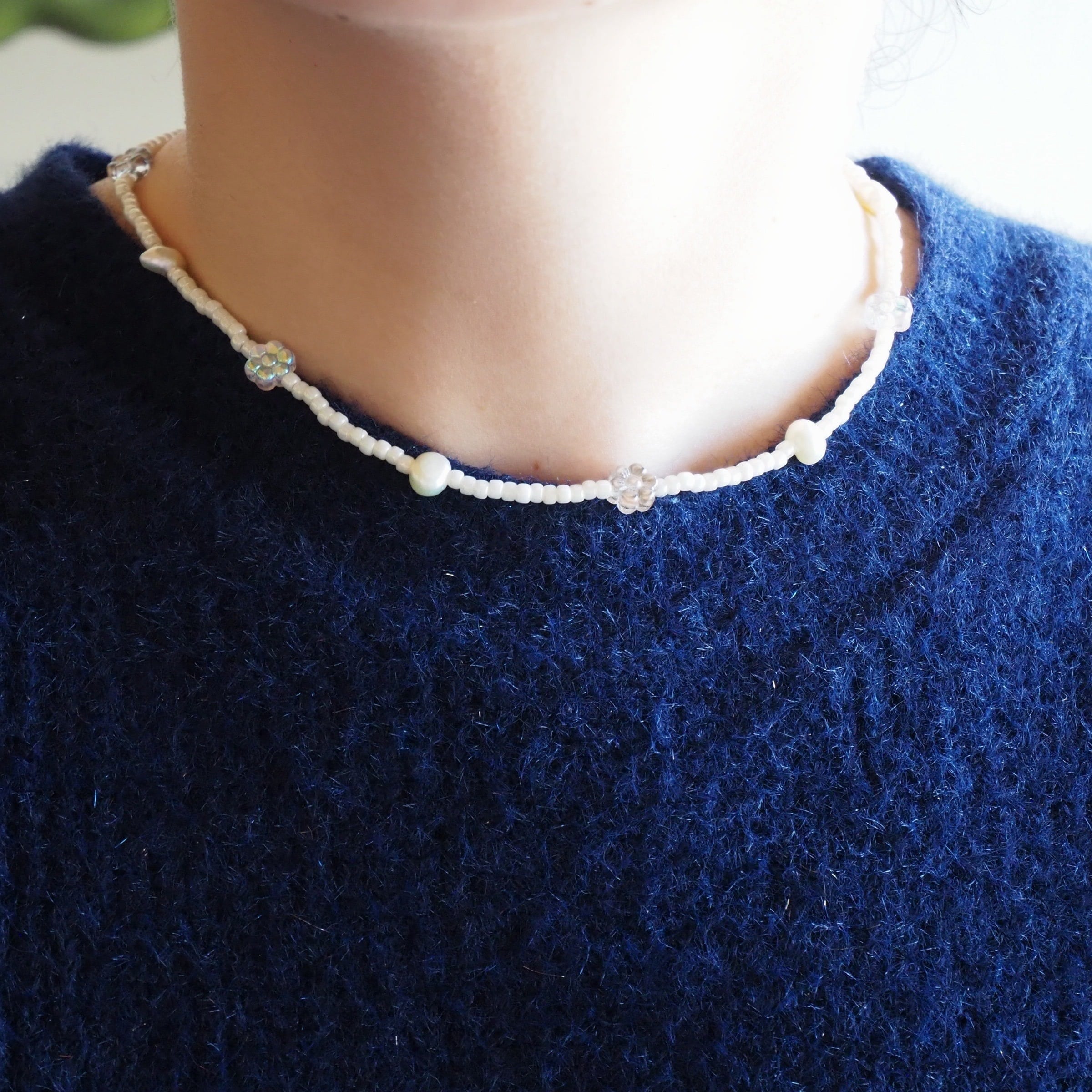 チェコビーズと淡水パールのビーズネックレス(スノーホワイト)