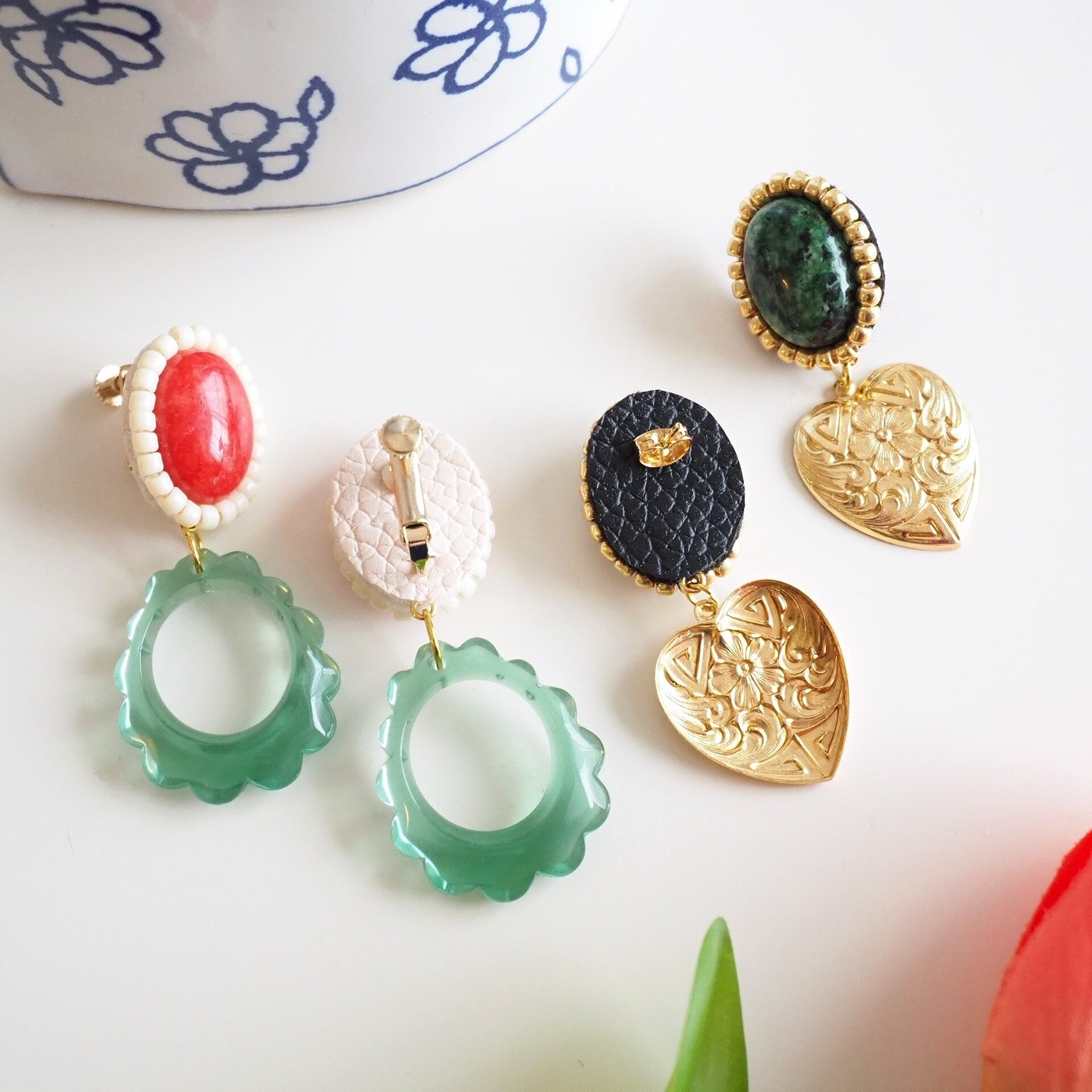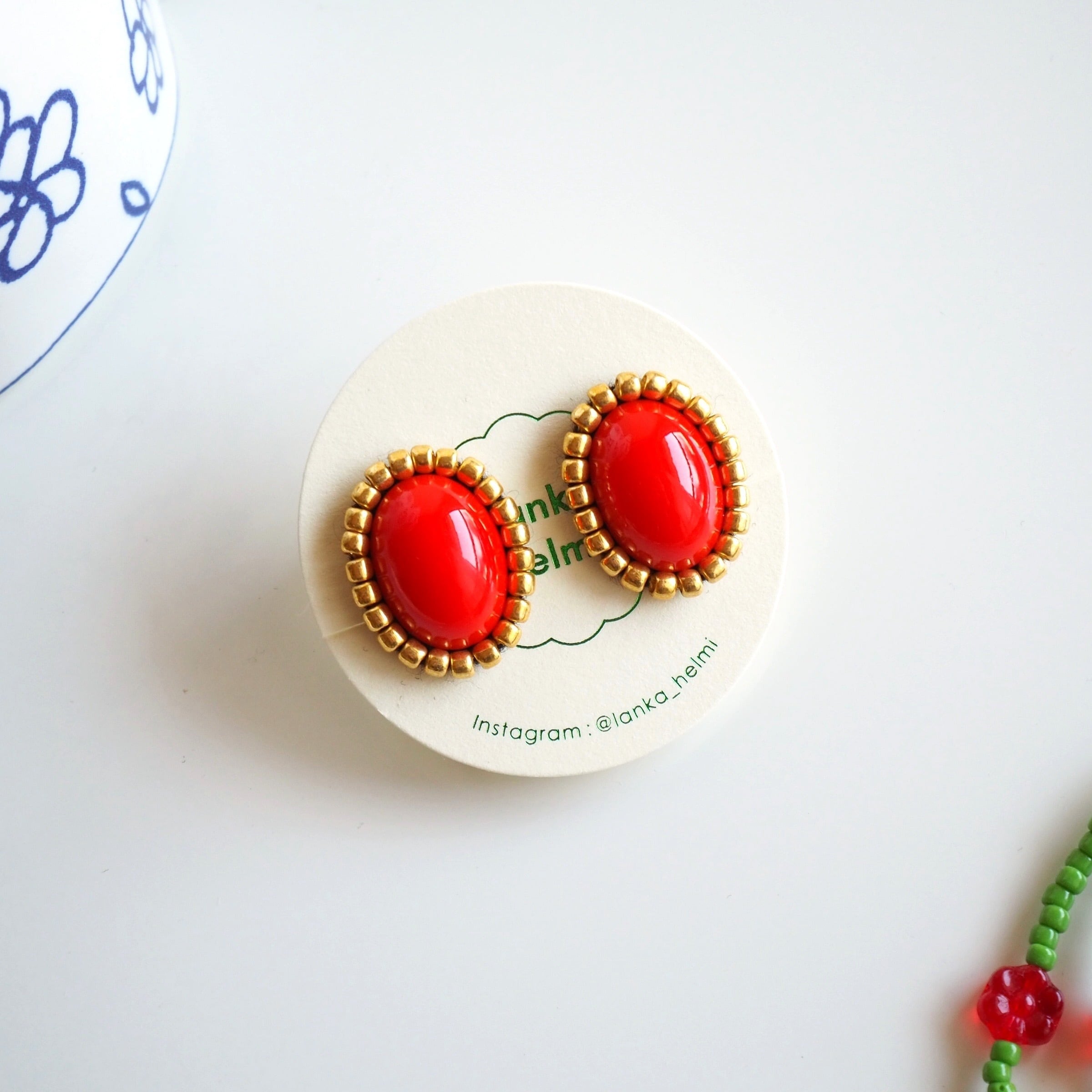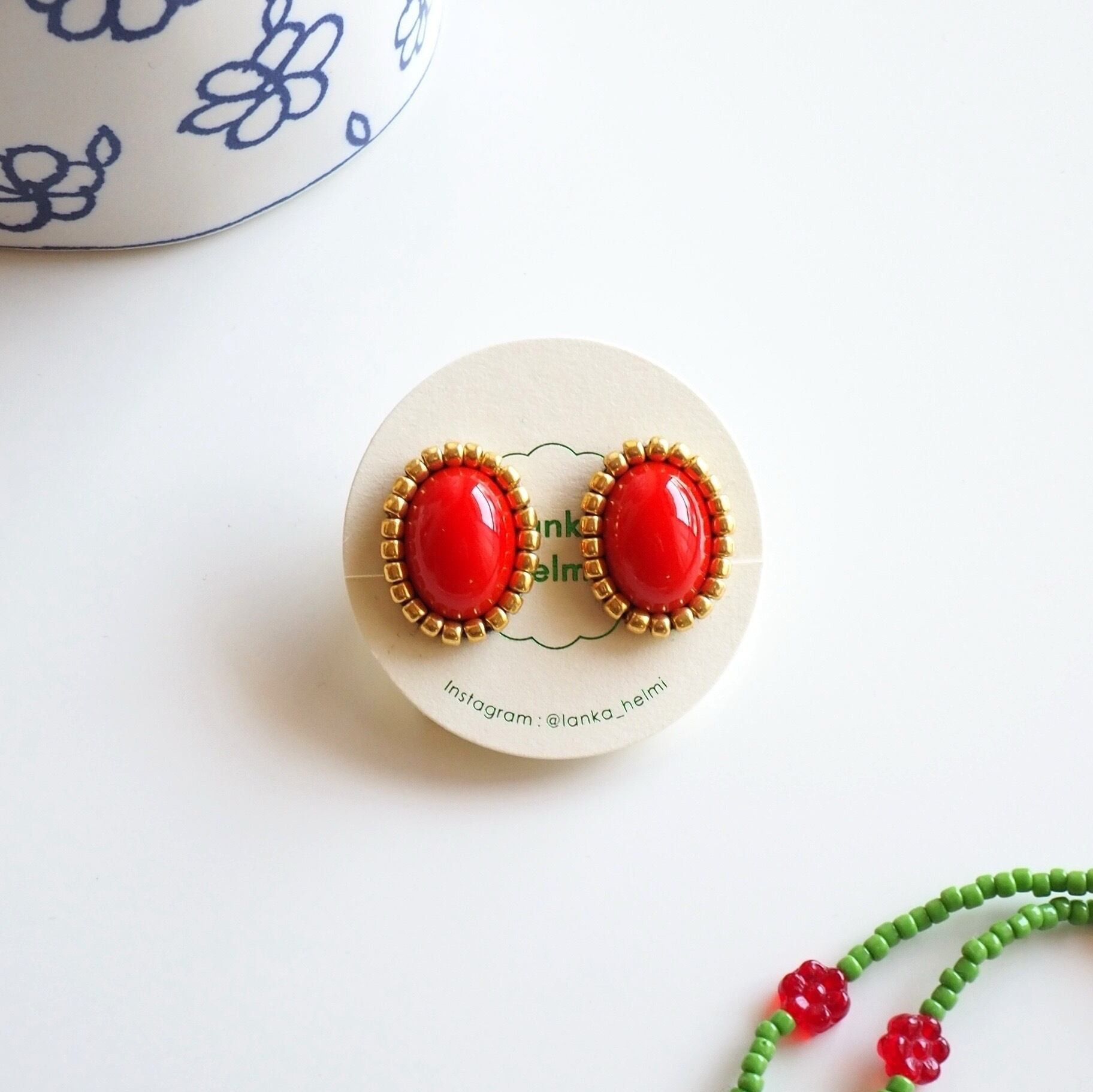 赤 レッド コーラルレッド ポピーレッド チェコガラスカボション オーバルカボション 一粒ピアス 一粒イヤリング シンプル ゴールド 金 70年代 70s 70年代ファッション 80年代 80s 80年代ファッション シンプル レトロ レトロピアス レトロイヤリング レトロアクセサリー ビーズ刺繍 刺繍イヤリング 刺繍ピアス 古着屋