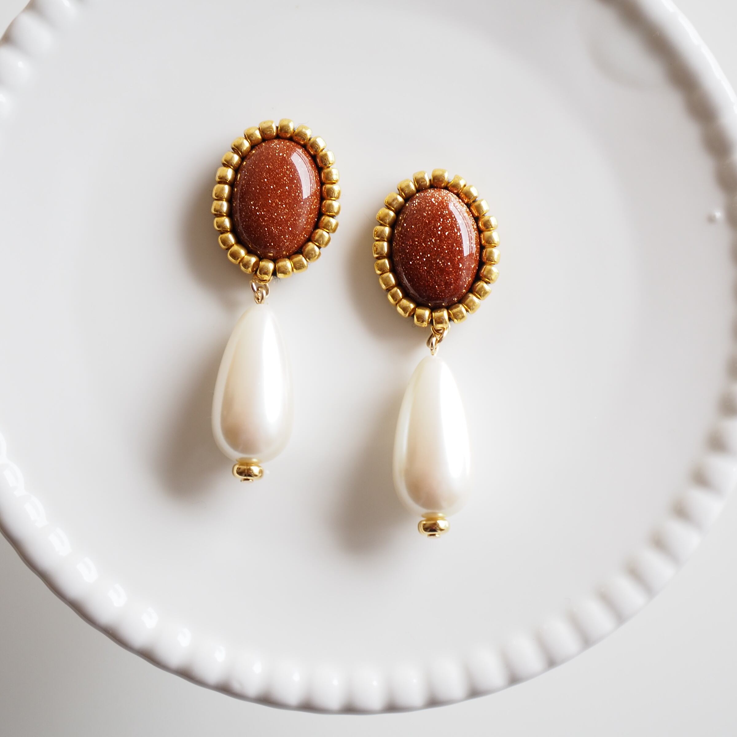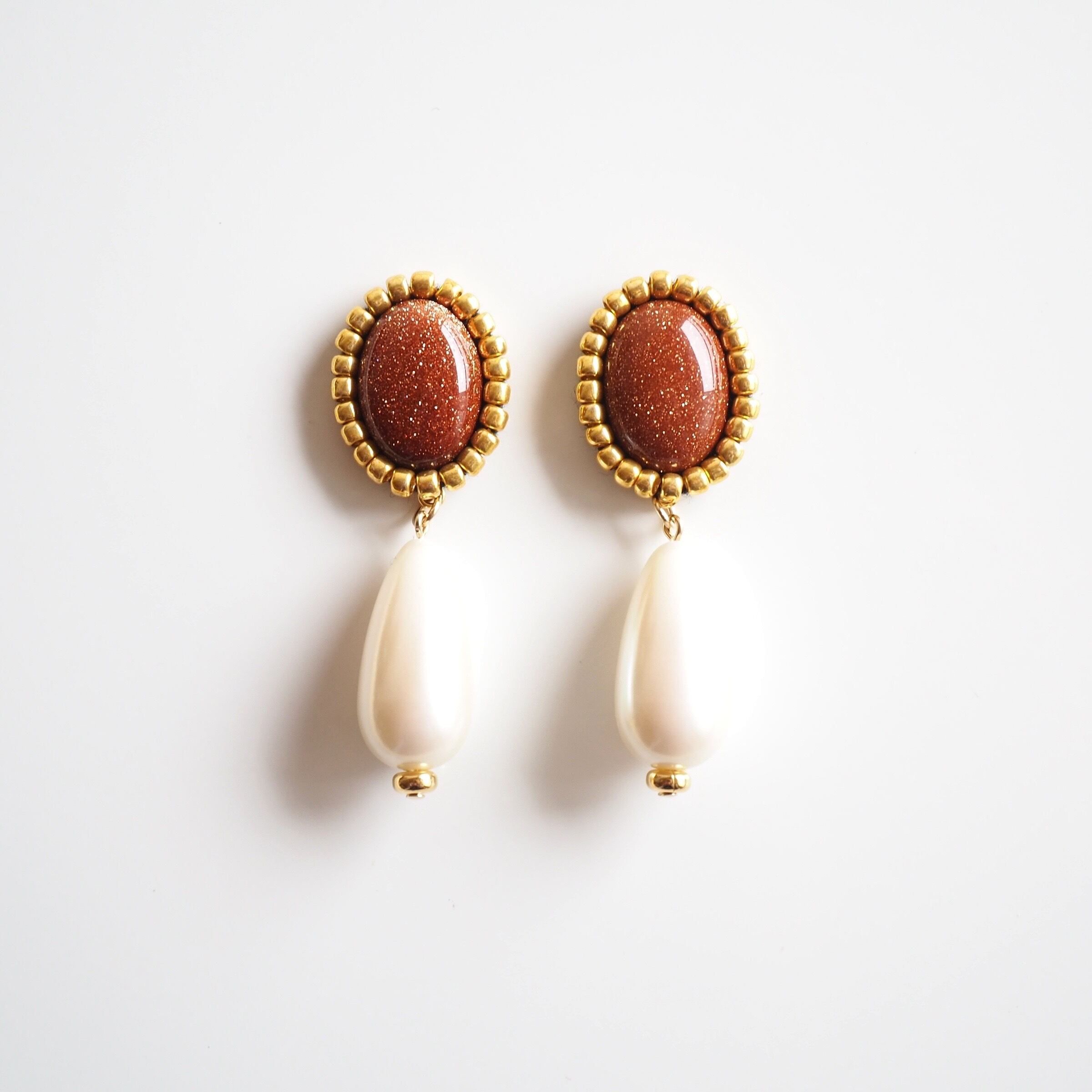 パール ドロップパール ブラウン 茶色 ゴールド 金色 ゴールドサンドストーン カボション オーバルカボション 80年代 80s 80年代ファッション レトロ レトロピアス レトロイヤリング レトロアクセサリー ビーズ刺繍 刺繍イヤリング 刺繍ピアス 揺れる ゆらゆら 真鍮 古着 古着屋 古着好き 個性的