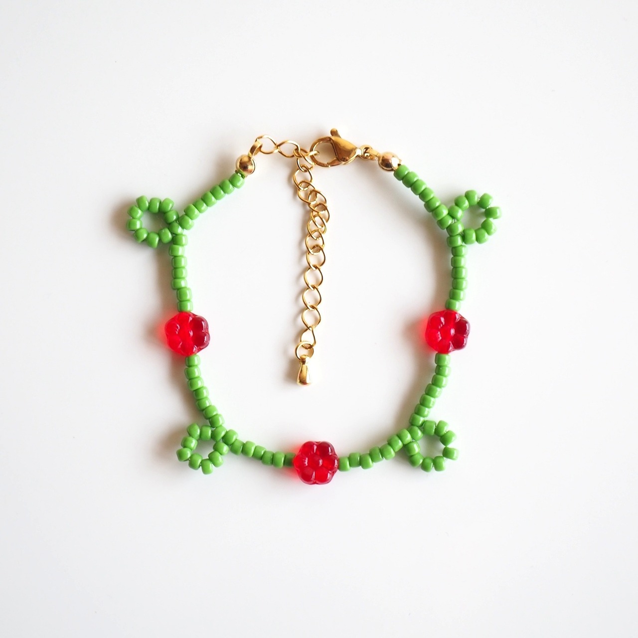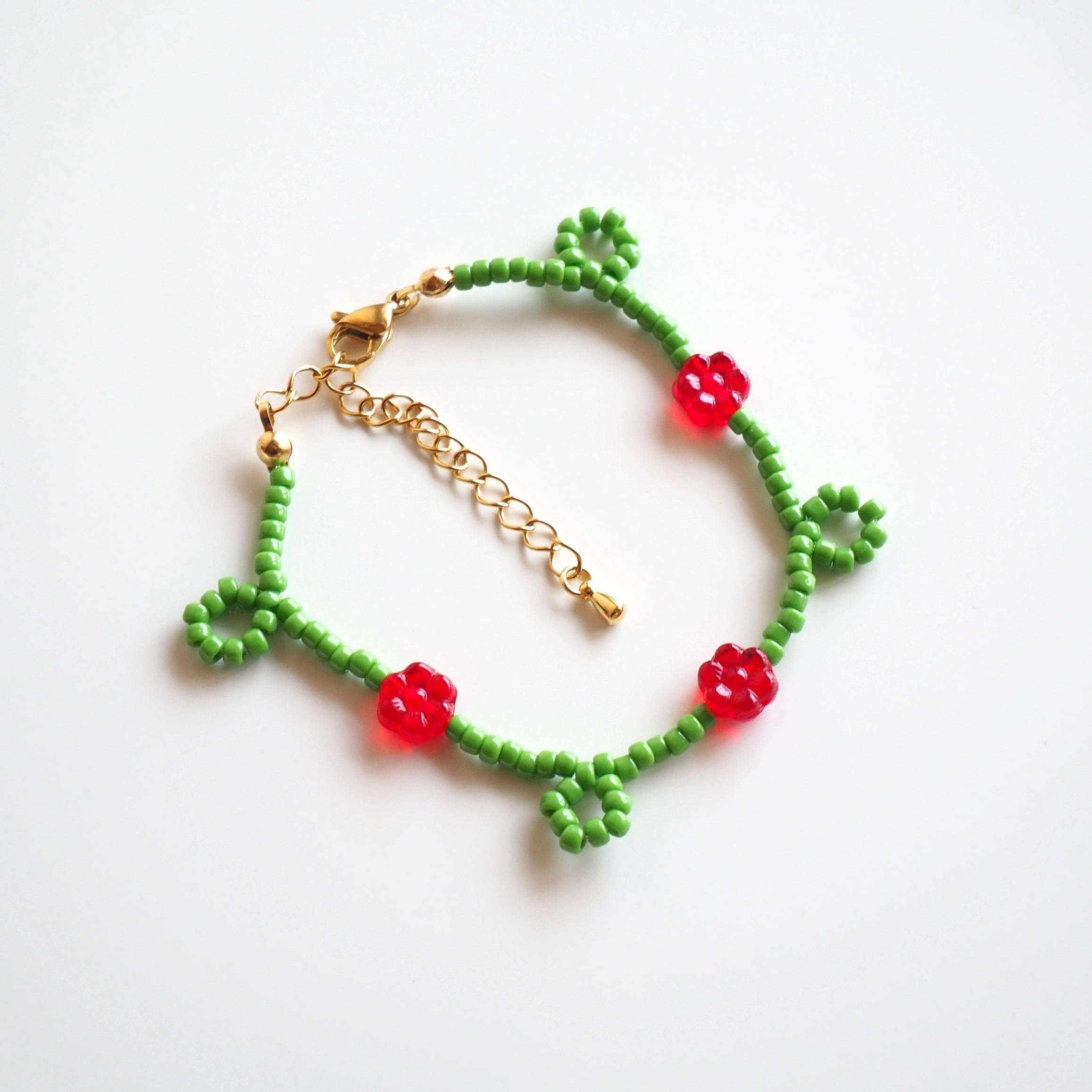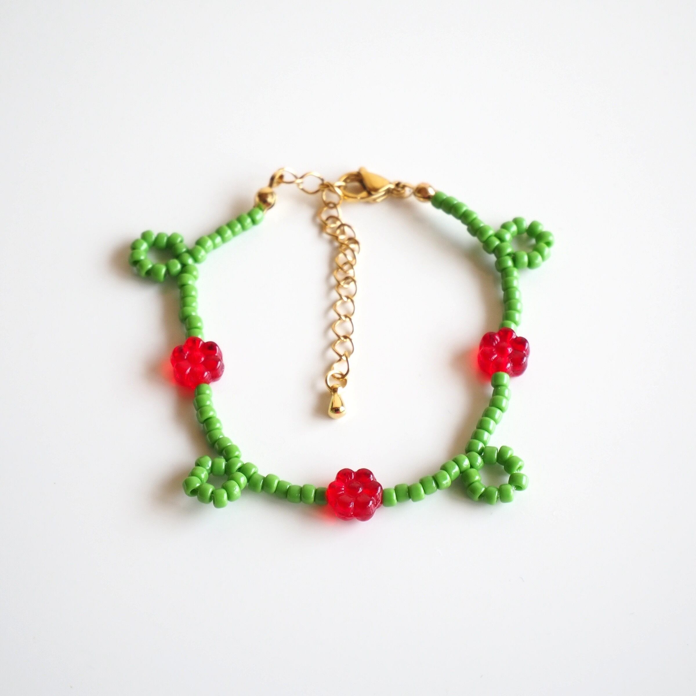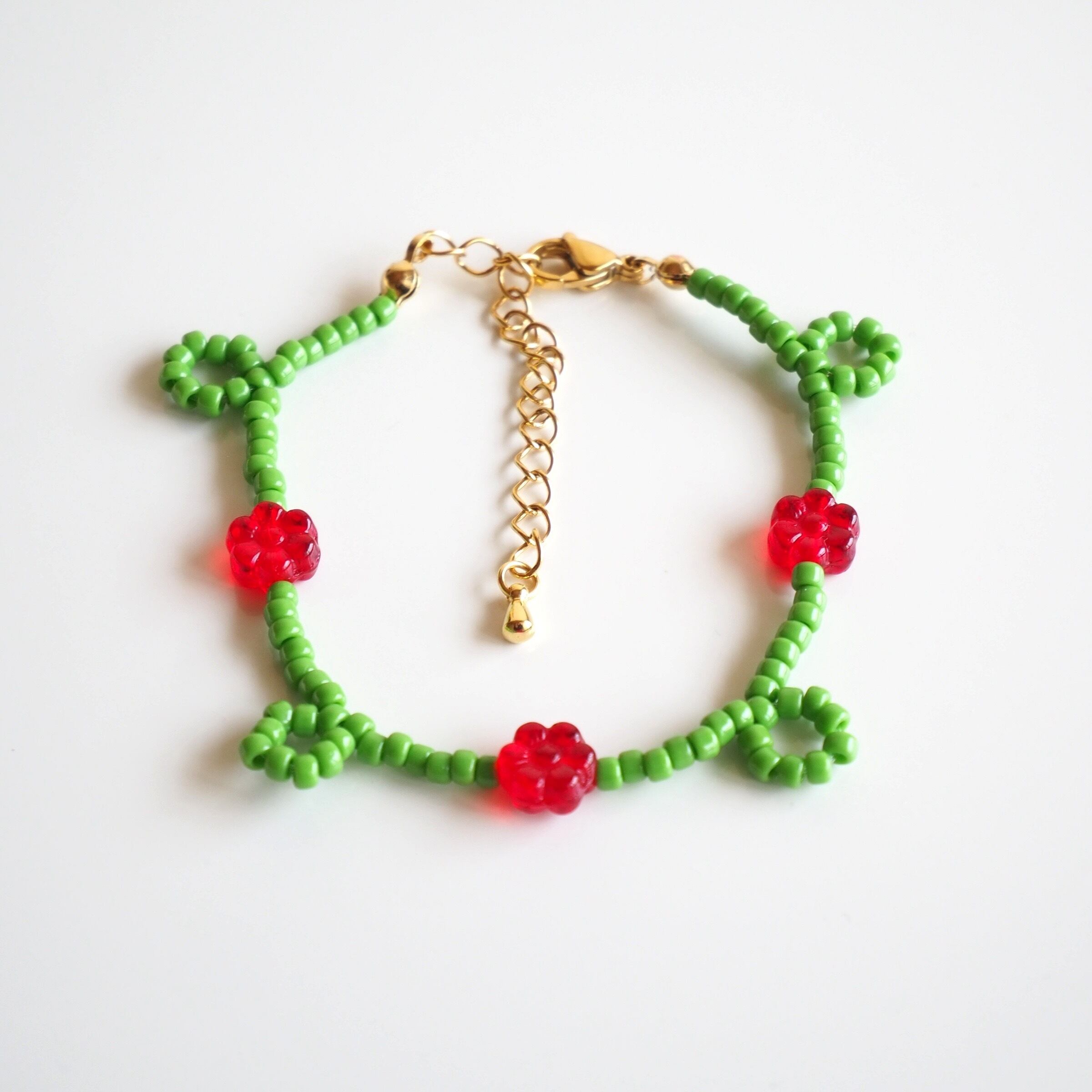 くるくるフラワービーズブレスレット(グリーン×レッド)