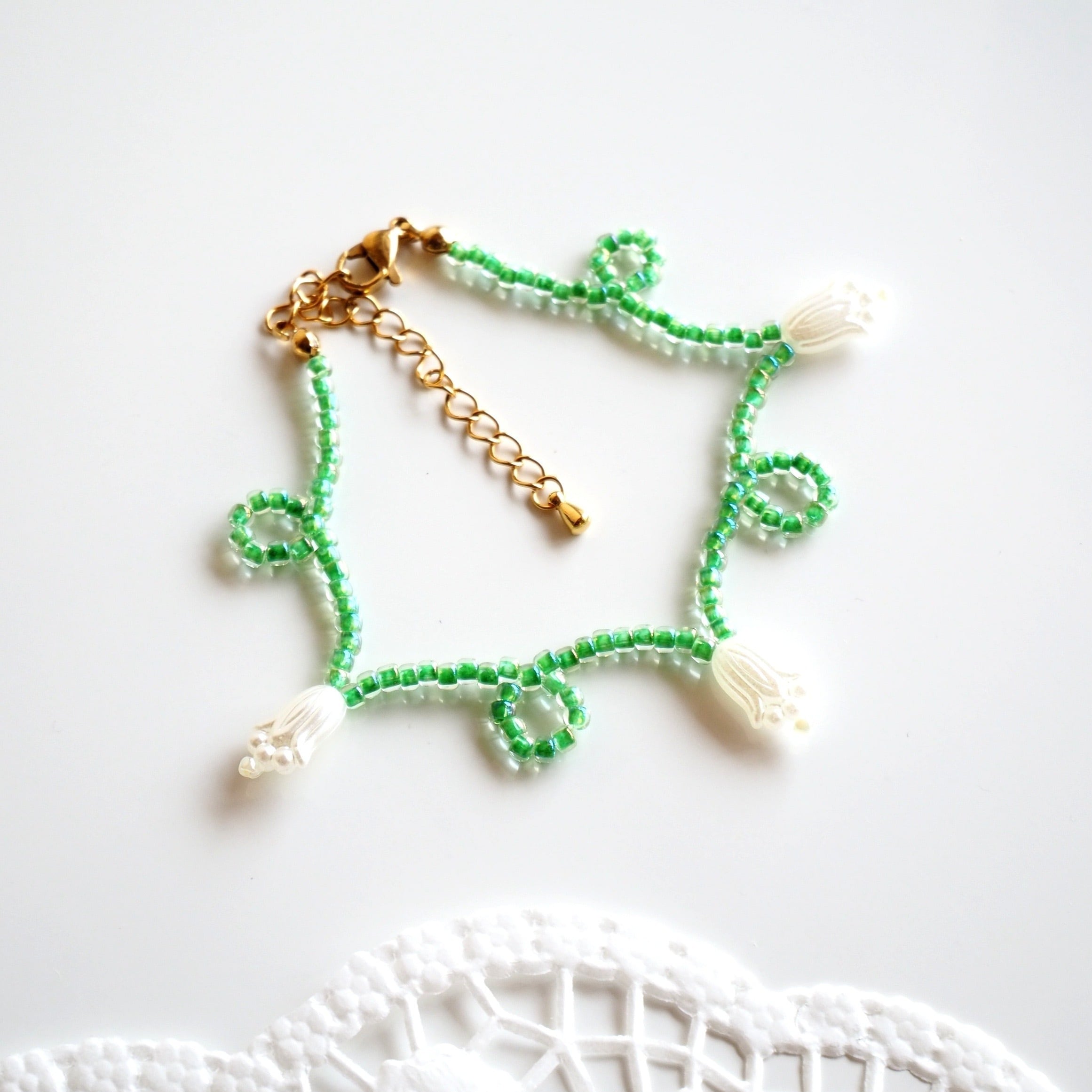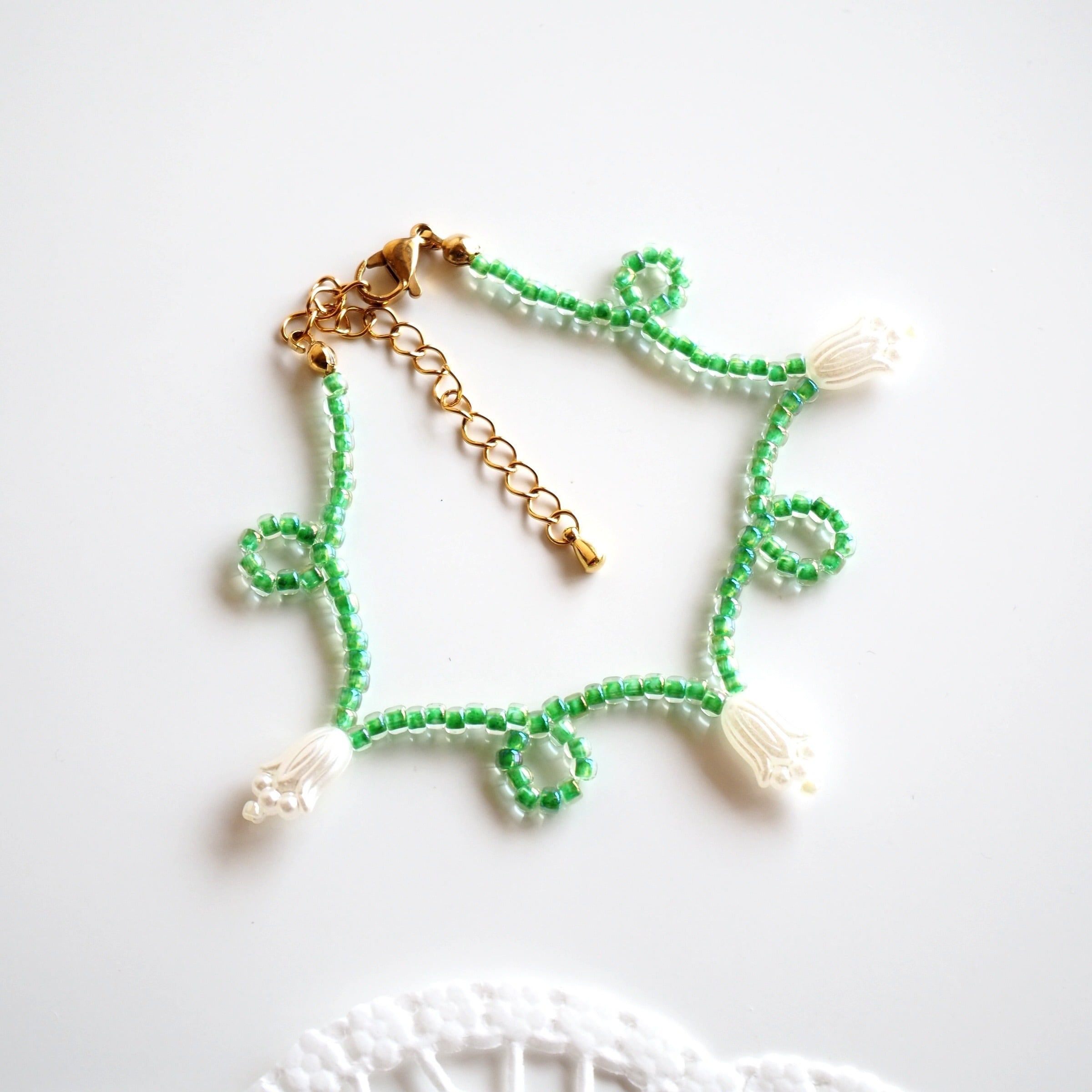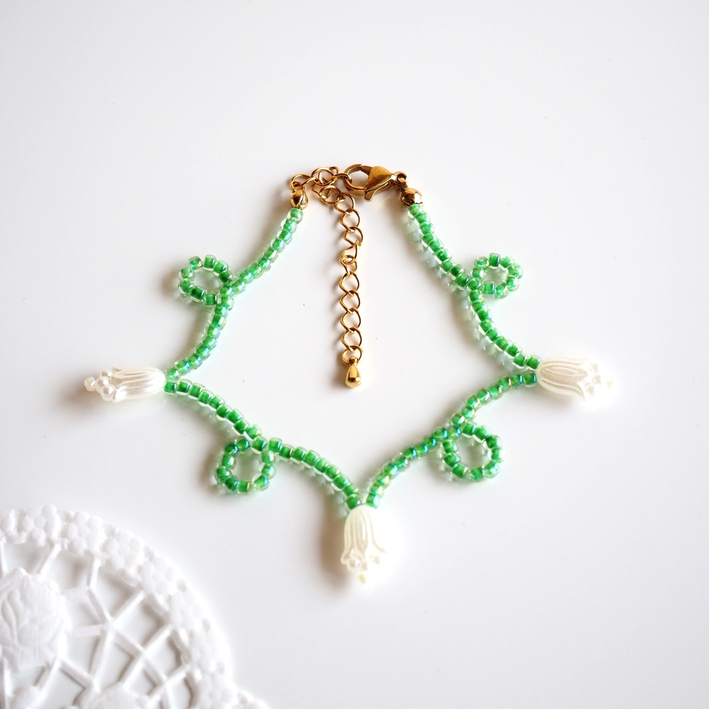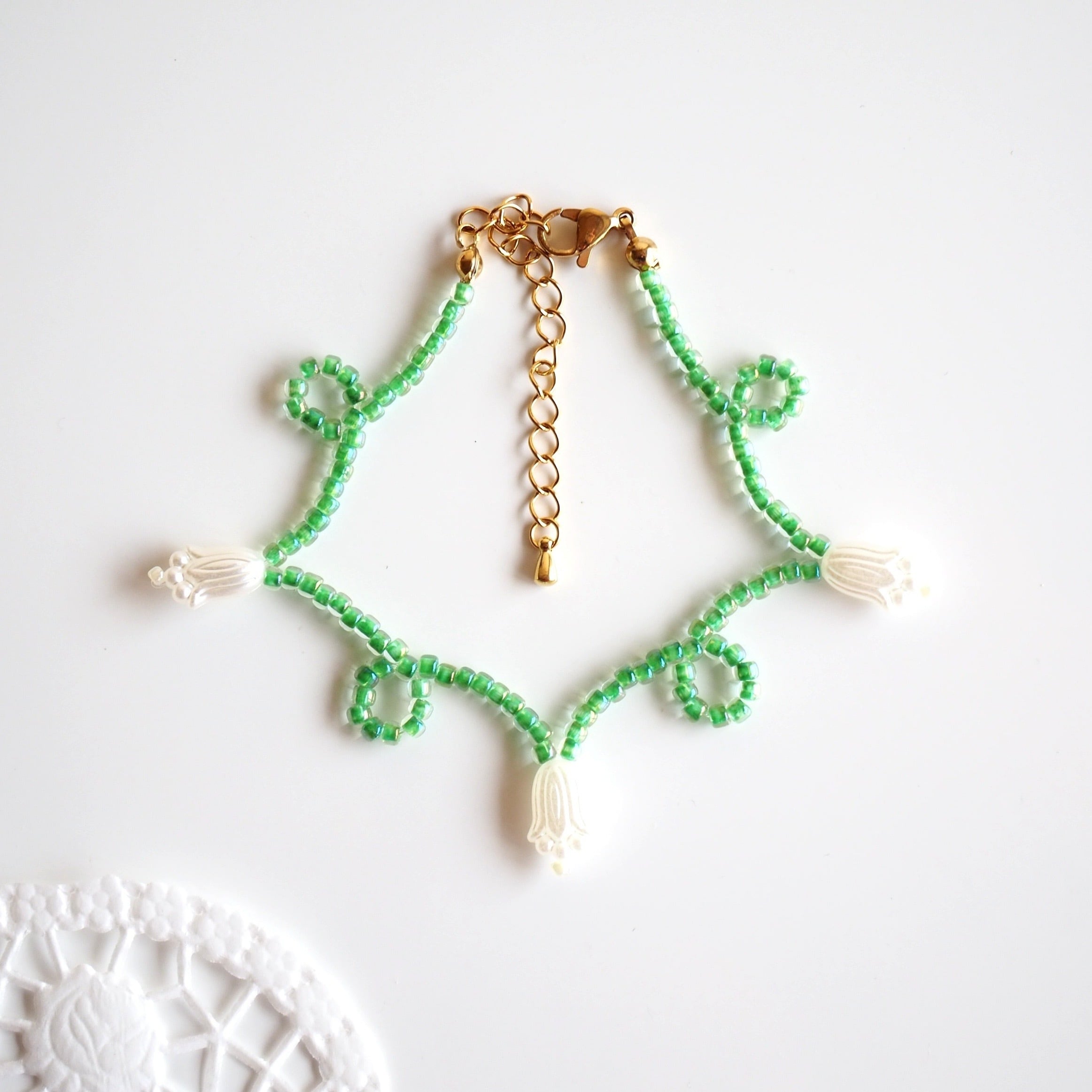 くるくるフラワービーズブレスレット(ミントグリーン×ホワイト)