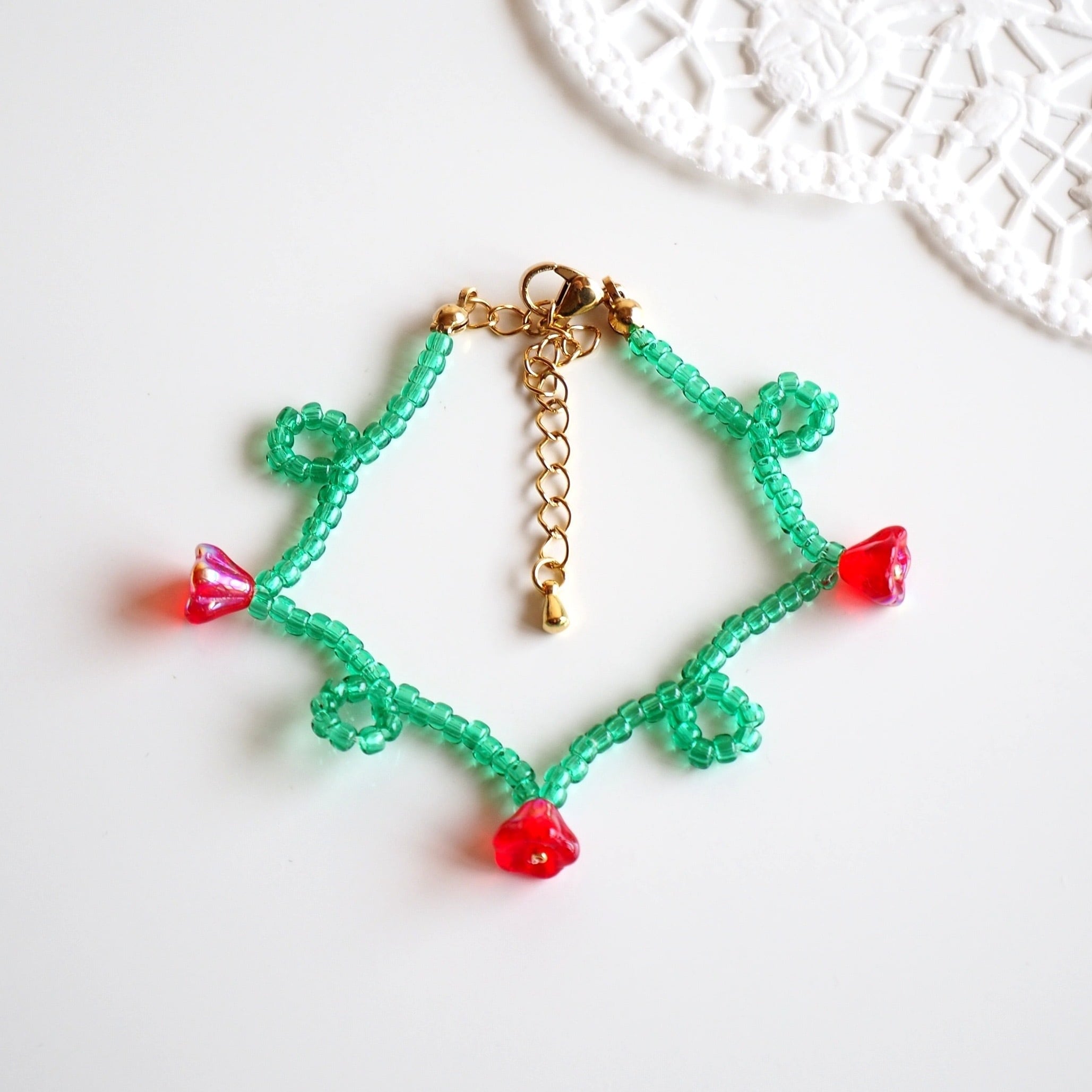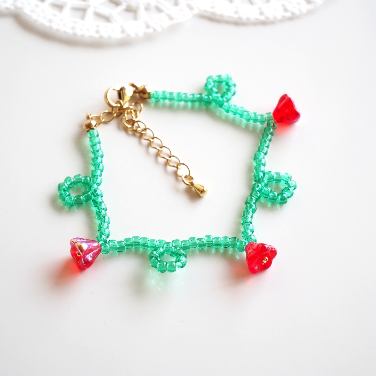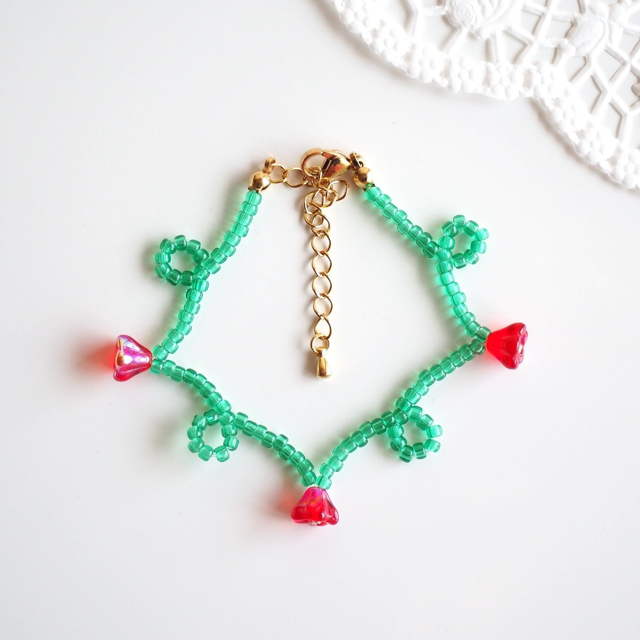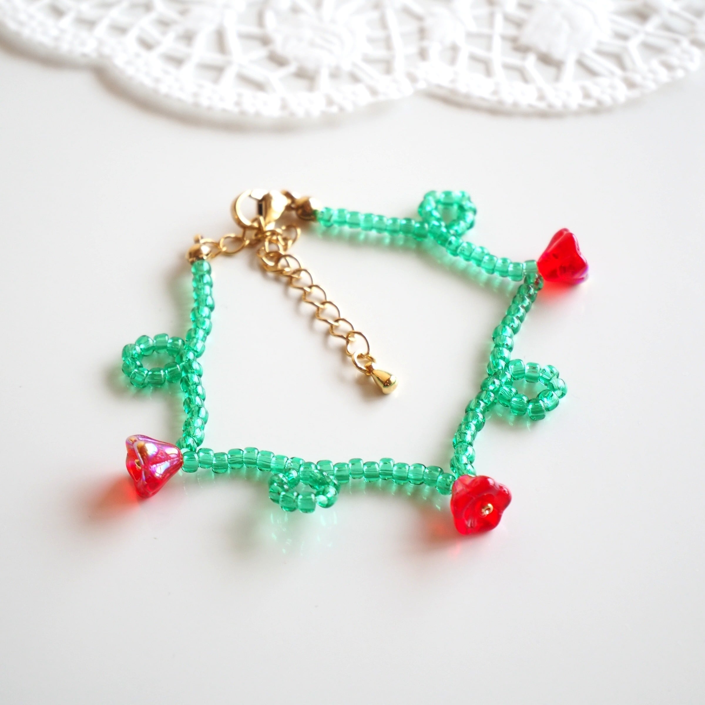 くるくるフラワービーズブレスレット(エメラルドグリーン×レッド)