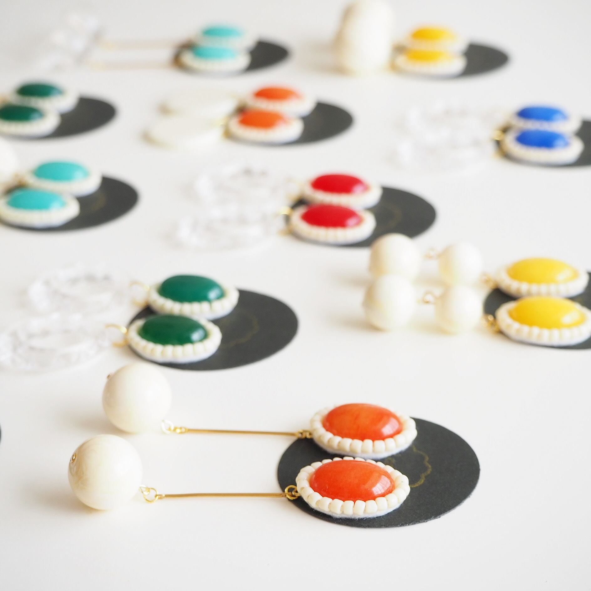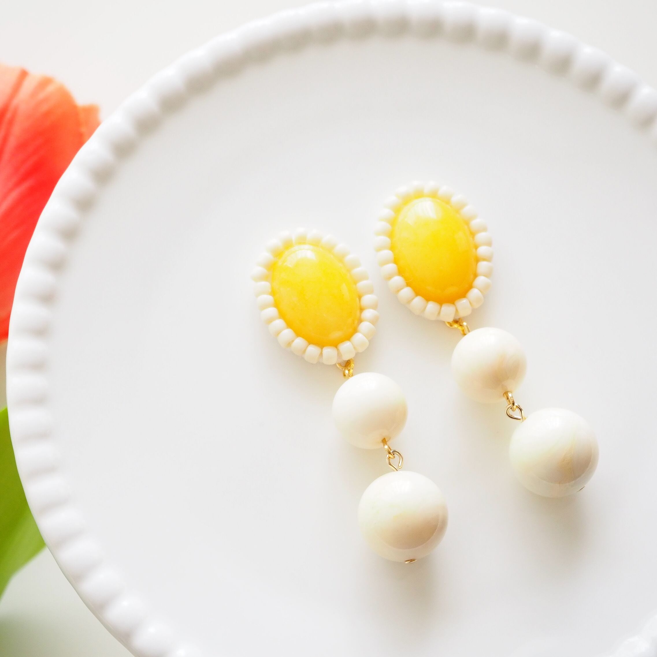 グミみたいなカボションのレトロなイヤリング/ピアス(イエロー×オフホワイト)no.2