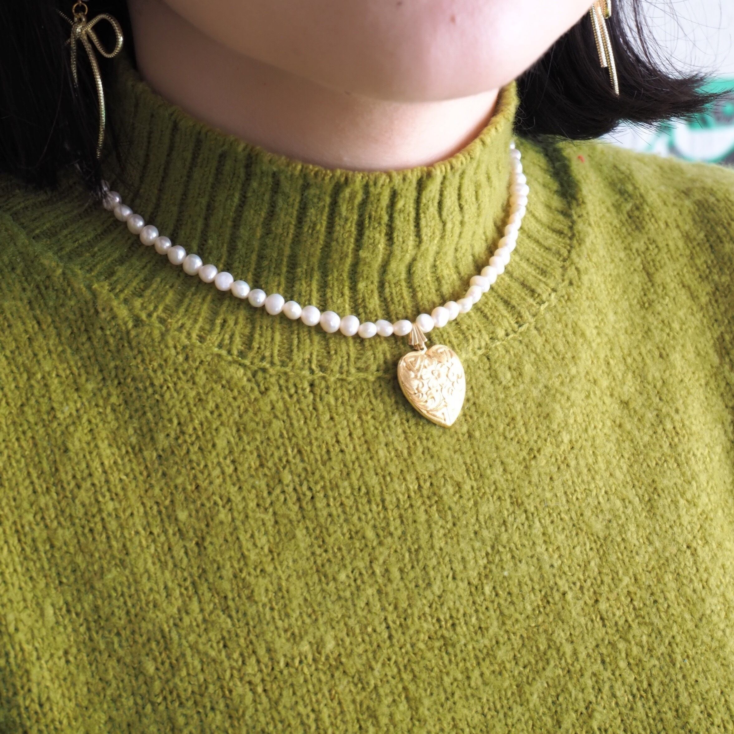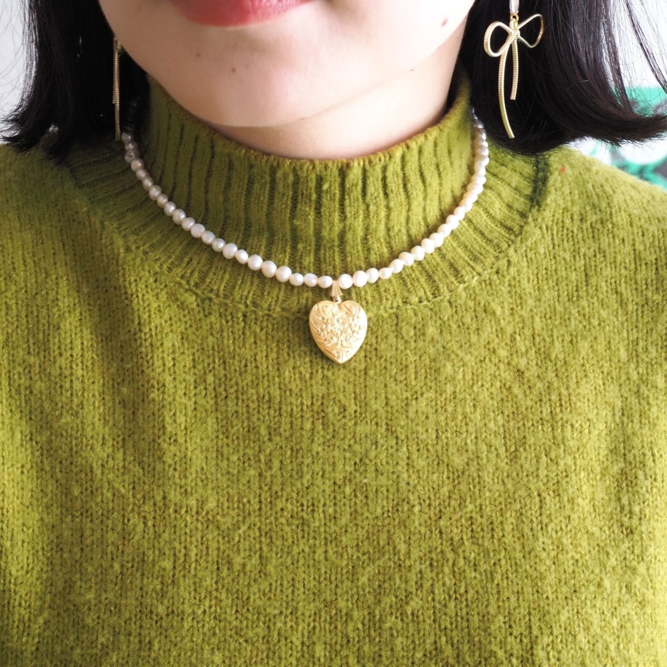 真鍮のハートチャームと淡水パールを用いた