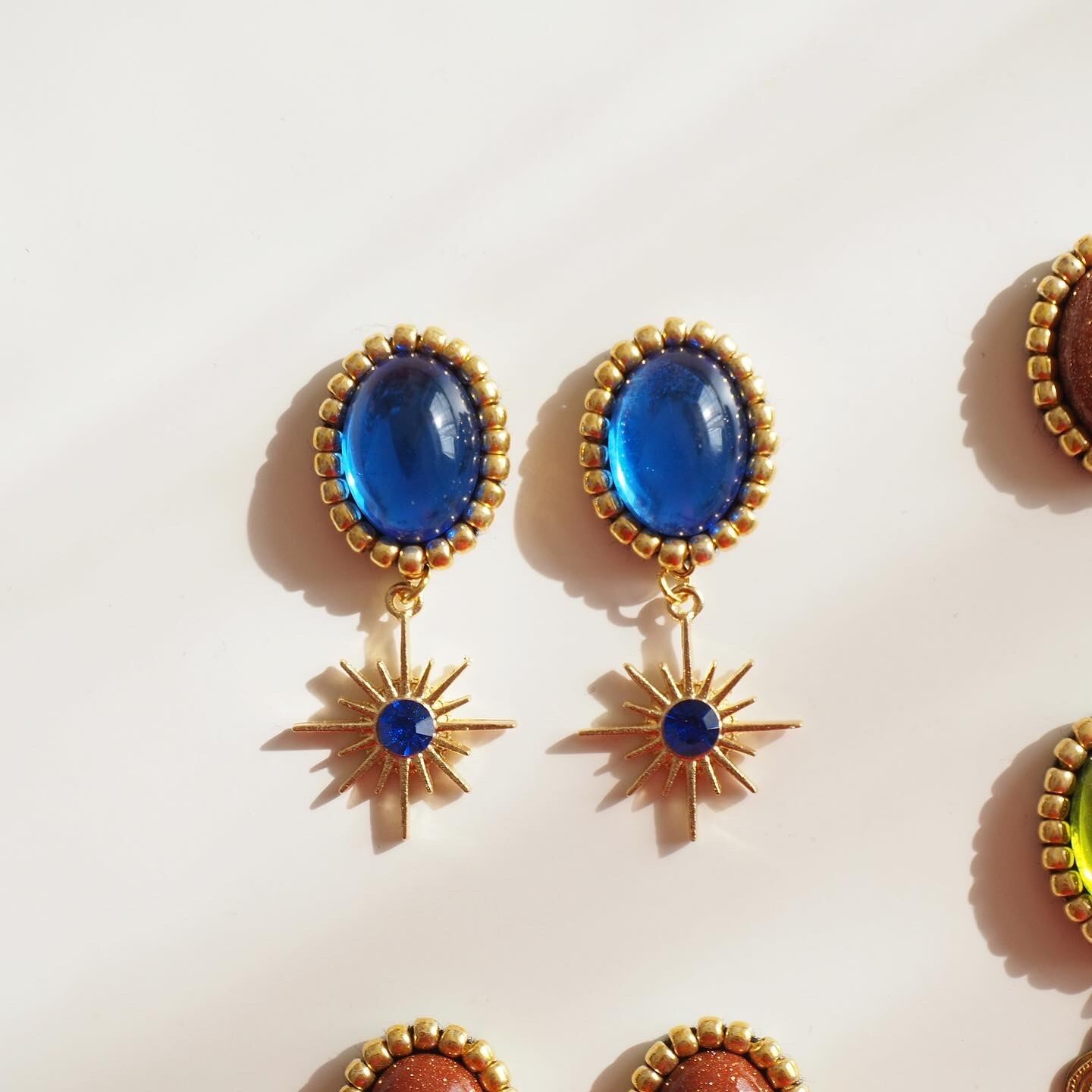 ブルー ライトブルー 青 チェコガラス チェコガラスカボション カボション 80年代 80s 80年代ファッション レトロピアス レトロイヤリング レトロアクセサリー ビーズ刺繍 刺繍イヤリング 刺繍ピアス 星チャーム スター 星モチーフ 揺れる ゆらゆら 真鍮 古着 古着好き 個性的