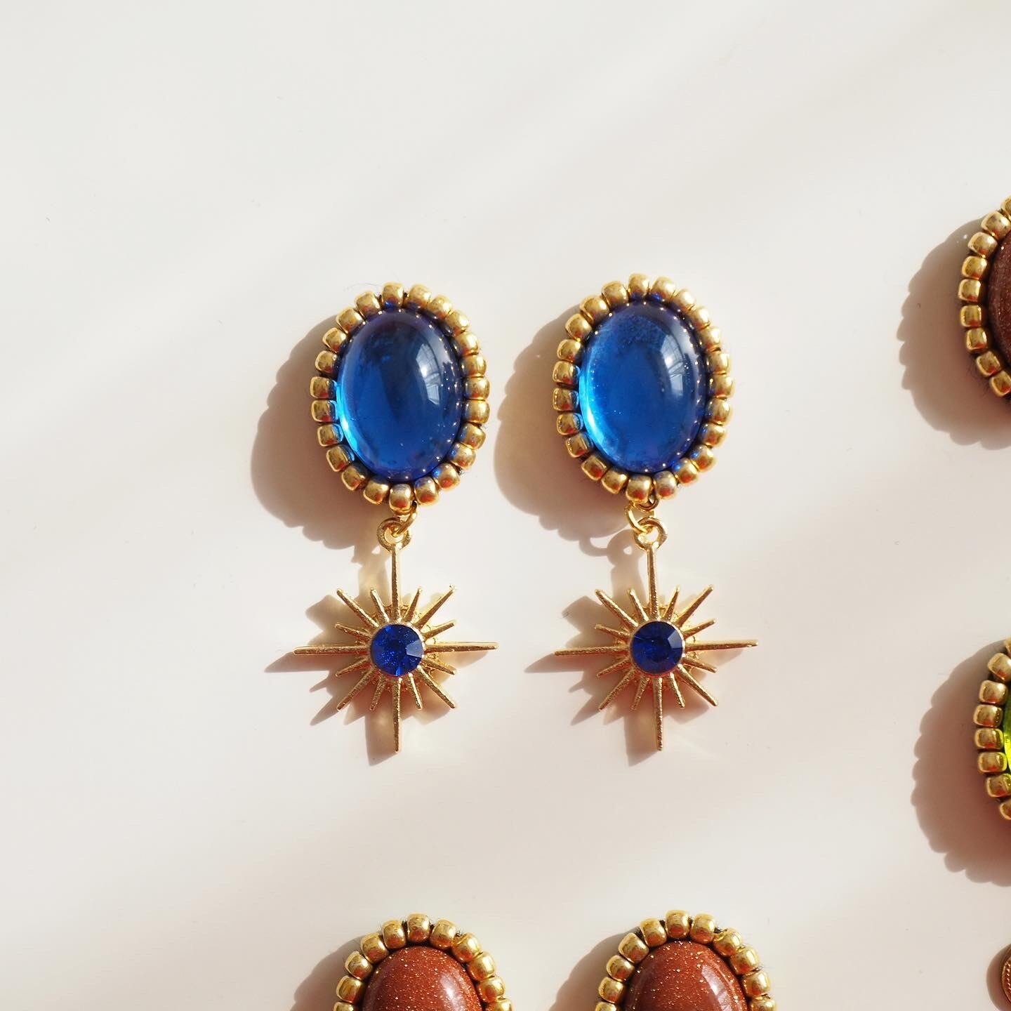 【OUTLET SALE】チェコガラスカボションと星のチャームのレトロイヤリング/ピアス(ブルー)