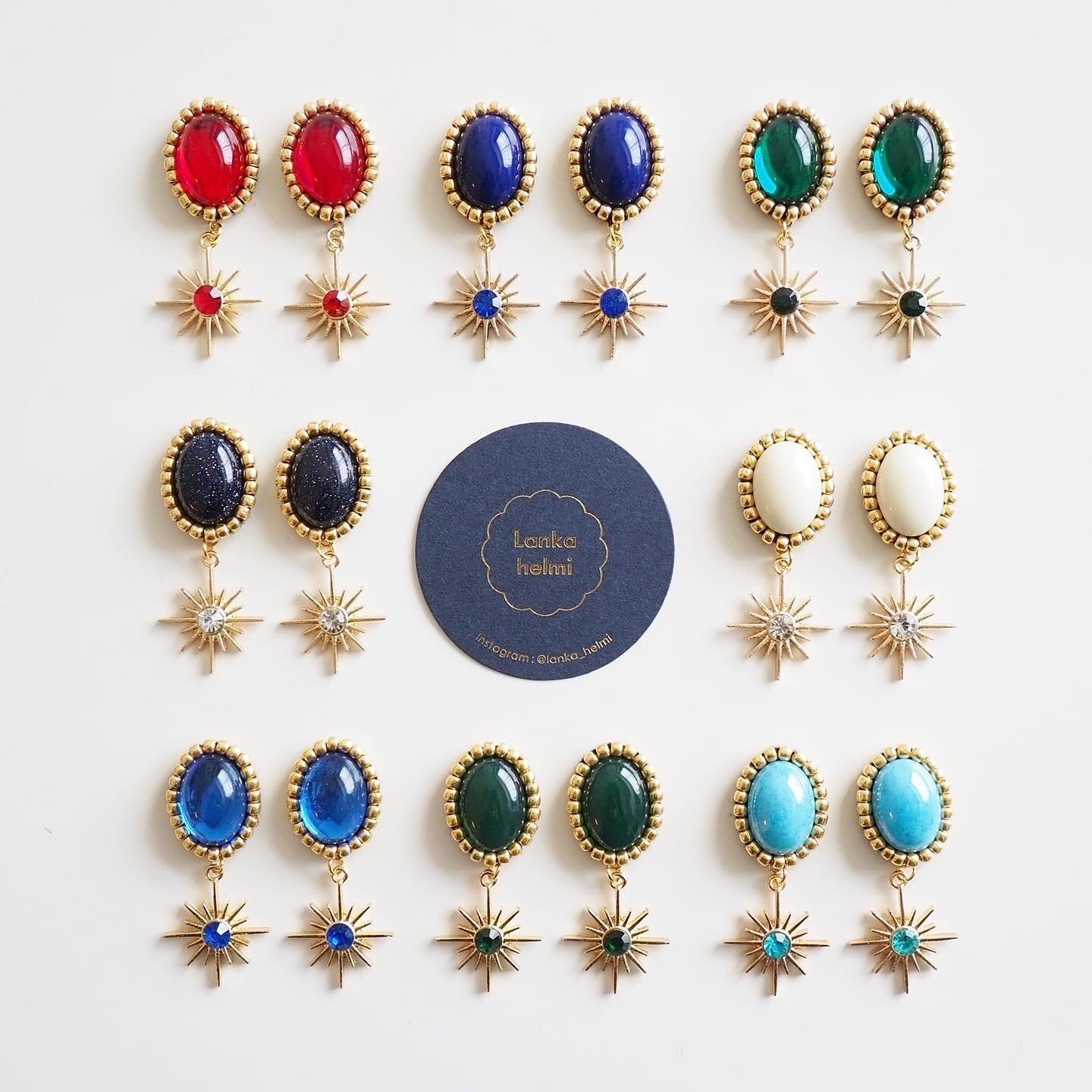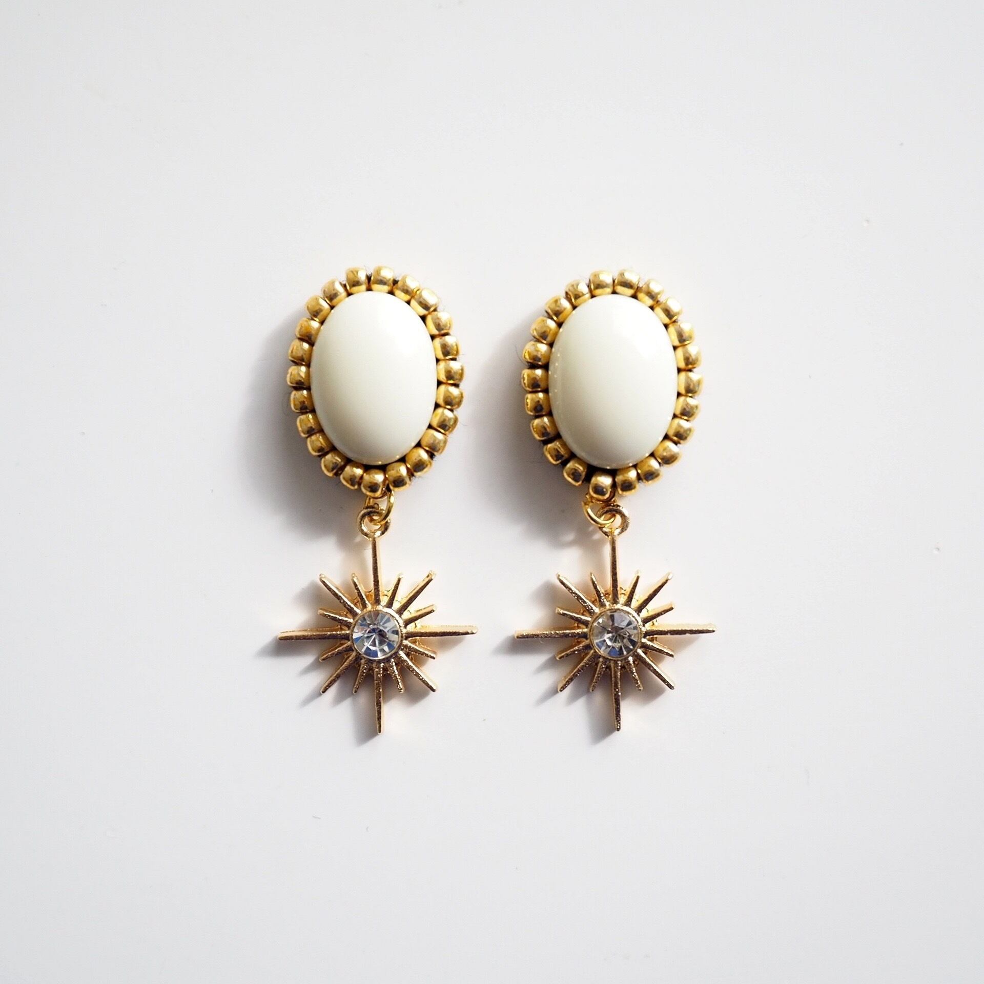 クリア 透明 白 ホワイト オフホワイト アイボリー カボション チェコガラスカボション チェコガラス オーバルカボション 80年代 80s 80年代ファッション レトロ レトロピアス レトロイヤリング レトロアクセサリー ビーズ刺繍 刺繍イヤリング 刺繍ピアス 星 スター 星モチーフ 星チャーム 揺れる ゆらゆら 真鍮 古着 古着屋 古着好き 個性的