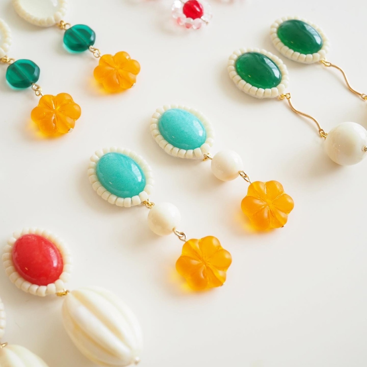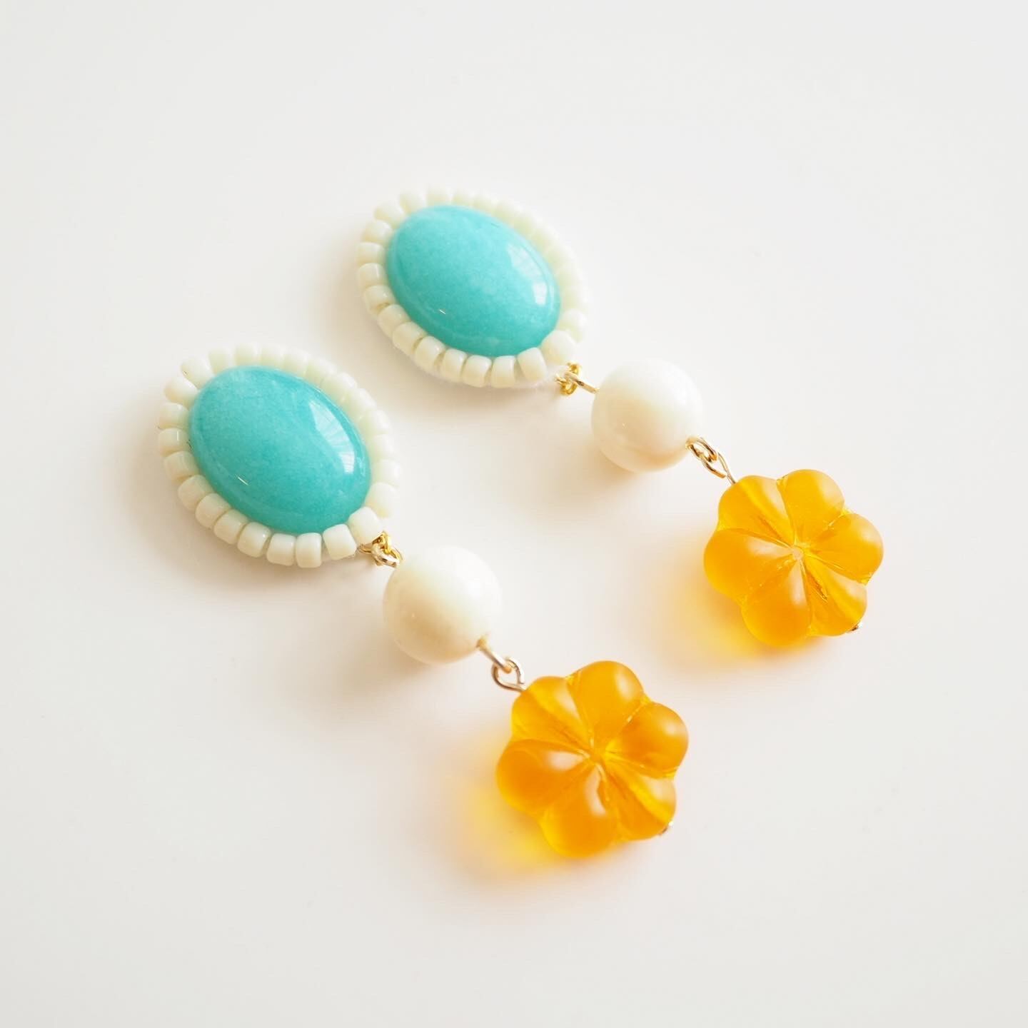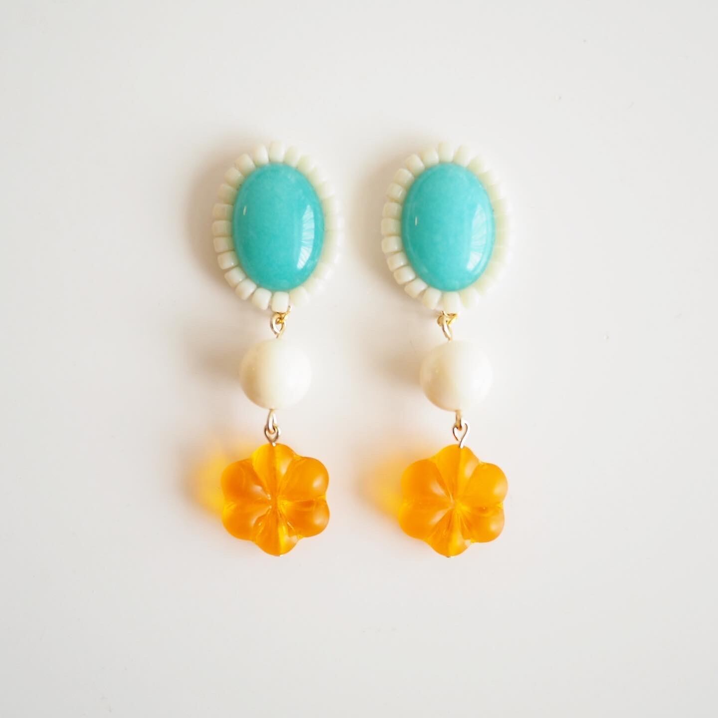 グミみたいなカボションのピアス/イヤリング(ライトブルー×オレンジフラワー)