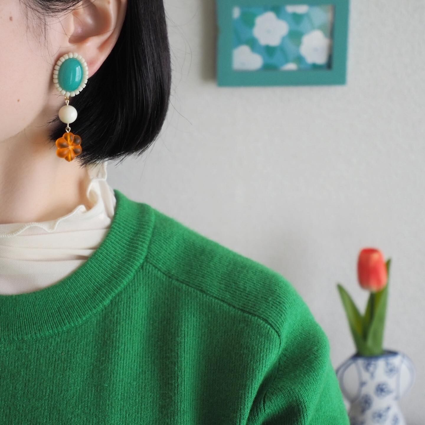 オレンジ 水色 ライトブルー オフホワイト 白 エクリュ 大振りイヤリング 大振りピアス プラスチック アクリル パール カラーパール 70年代 70s 70年代ファッション レトロポップ 昭和レトロ 古着 古着屋 レトロピアス レトロイヤリング レトロアクセサリー