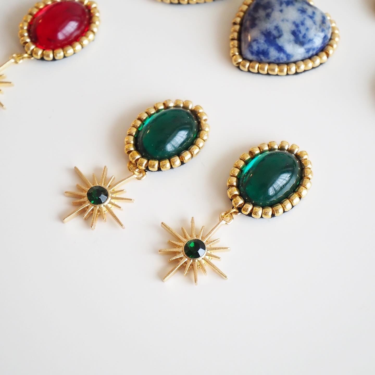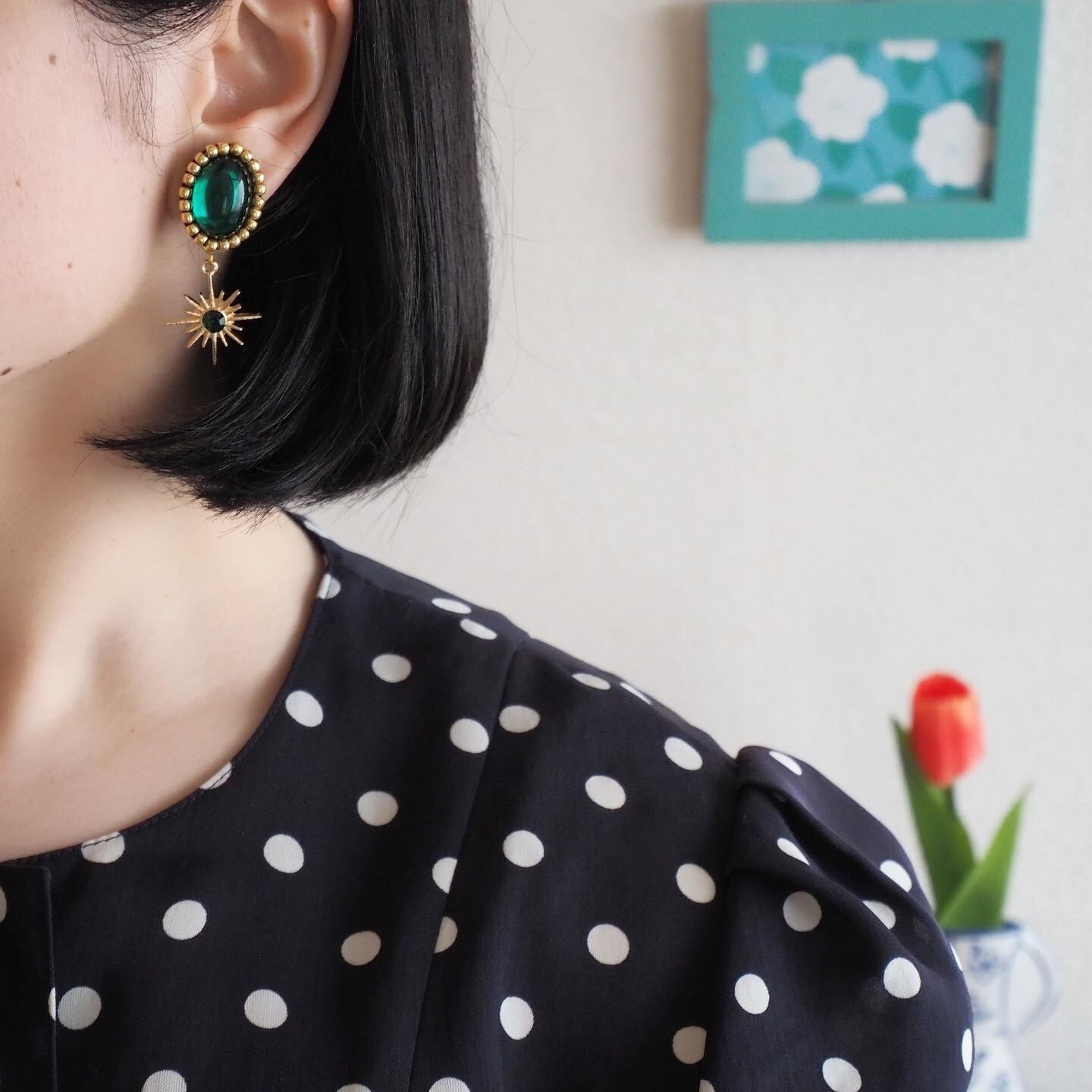 緑 グリーン チェコガラス チェコガラスカボション カボション 80年代 80s 80年代ファッション レトロピアス レトロイヤリング レトロアクセサリー ビーズ刺繍 刺繍イヤリング 刺繍ピアス 星チャーム スター 星モチーフ 揺れる ゆらゆら 真鍮 古着 古着好き 個性的