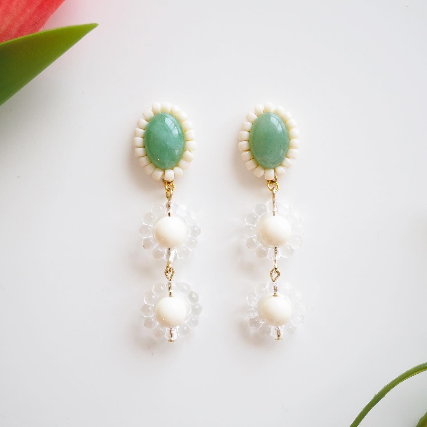 ミント ミントグリーン クリア 透明 クリア オフホワイト 白 大振りイヤリング 大振りピアス 揺れる ゆらゆら クリアアクセサリー プラスチック アクリル 70年代 70s 70年代ファッション レトロピアス レトロイヤリング レトロアクセサリー ビーズ刺繍 刺繍イヤリング 刺繍ピアス フラワー 花