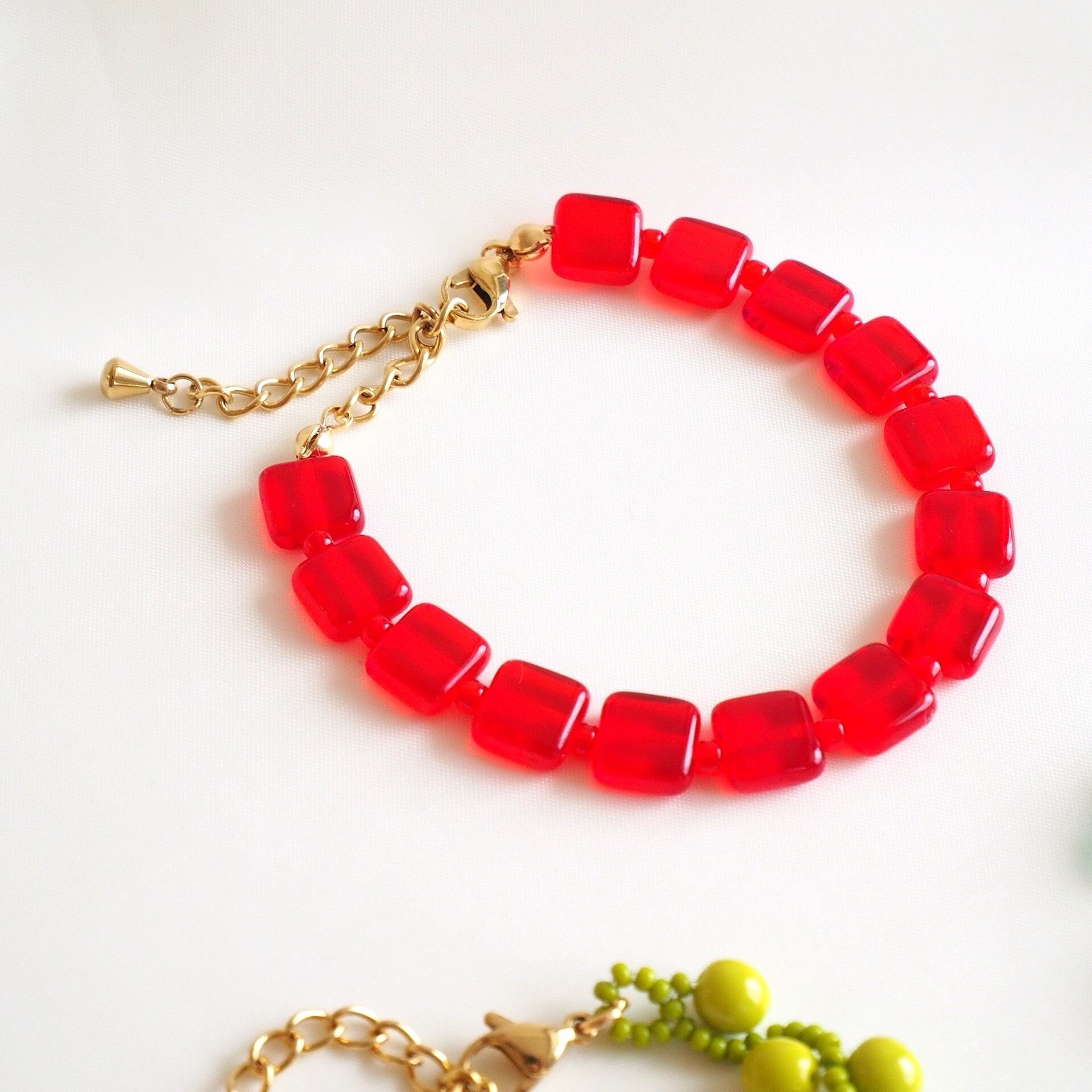 レトロなスクエアビーズのブレスレット(クリアレッド)