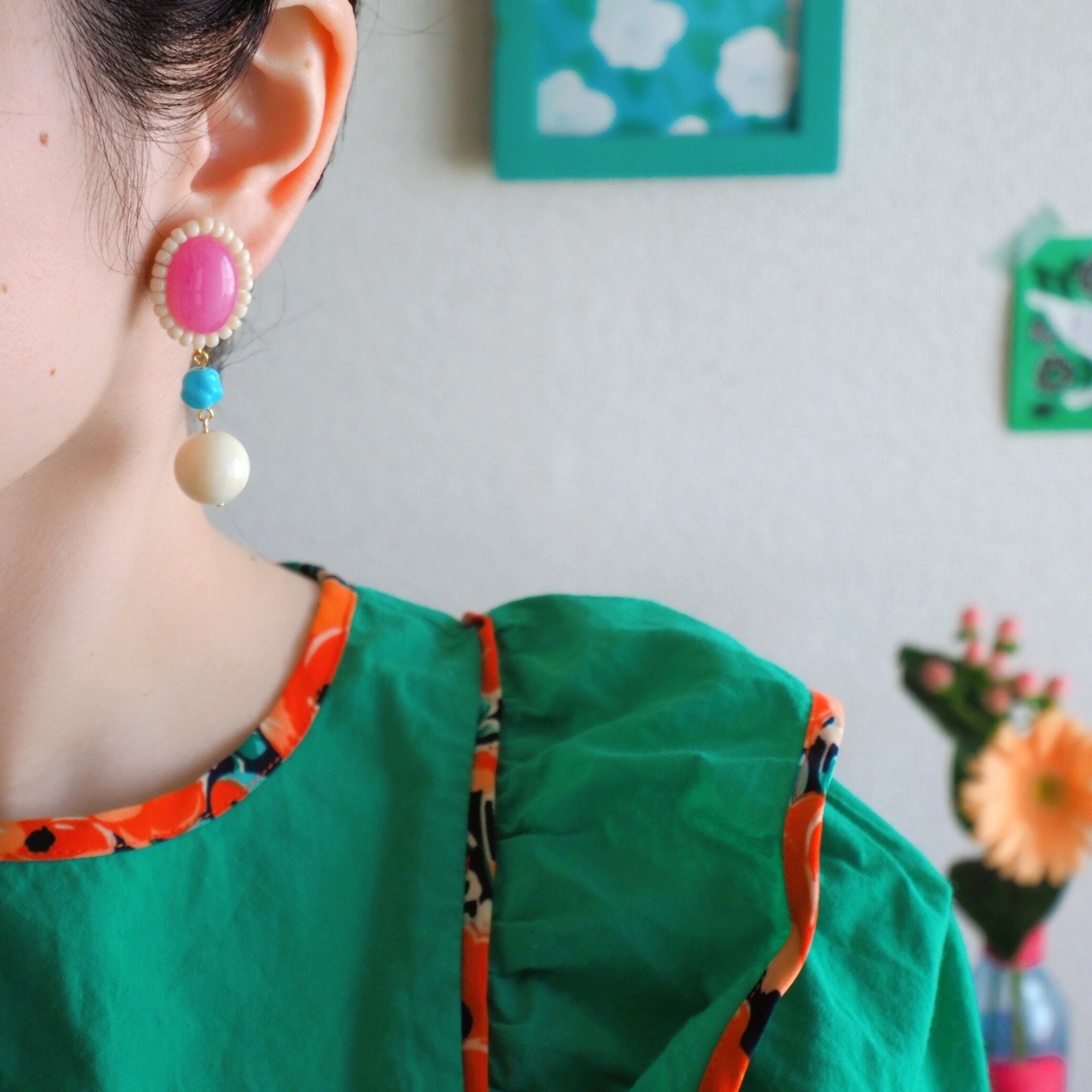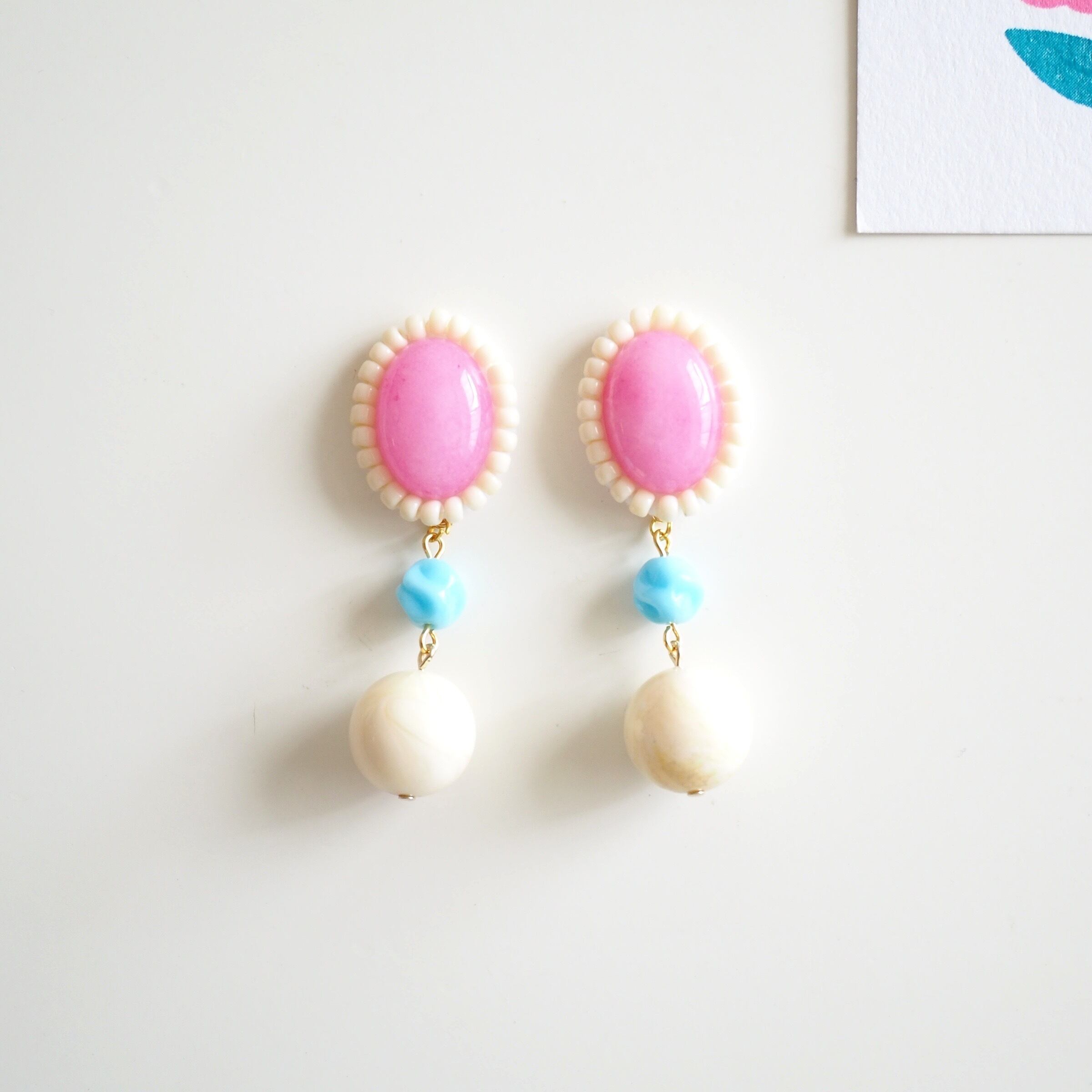 【Outlet sale!】グミみたいなカボションのレトロなイヤリング/ピアス(ピンク×ライトブルー)